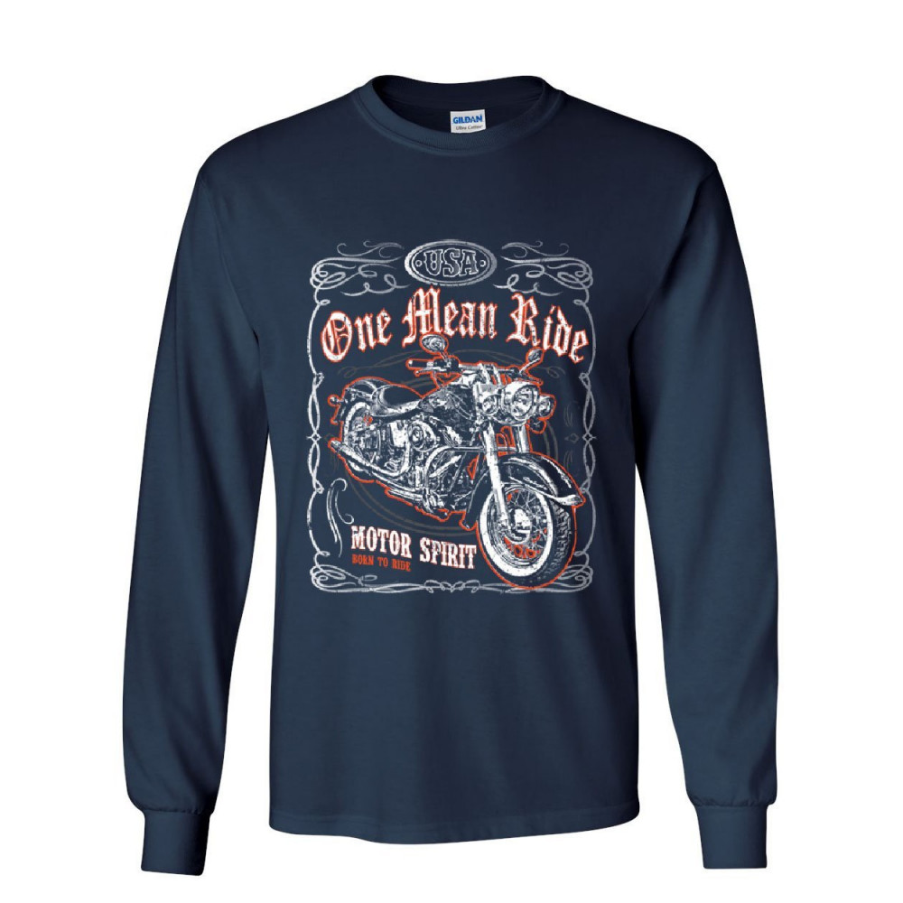 ONE MEAN RIDE long sleeve t-shirt born to ride chopper bobber route 66 biker tee navy blue