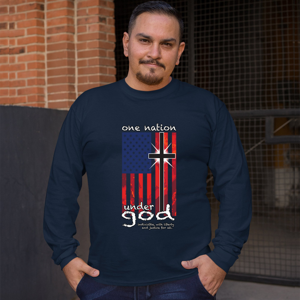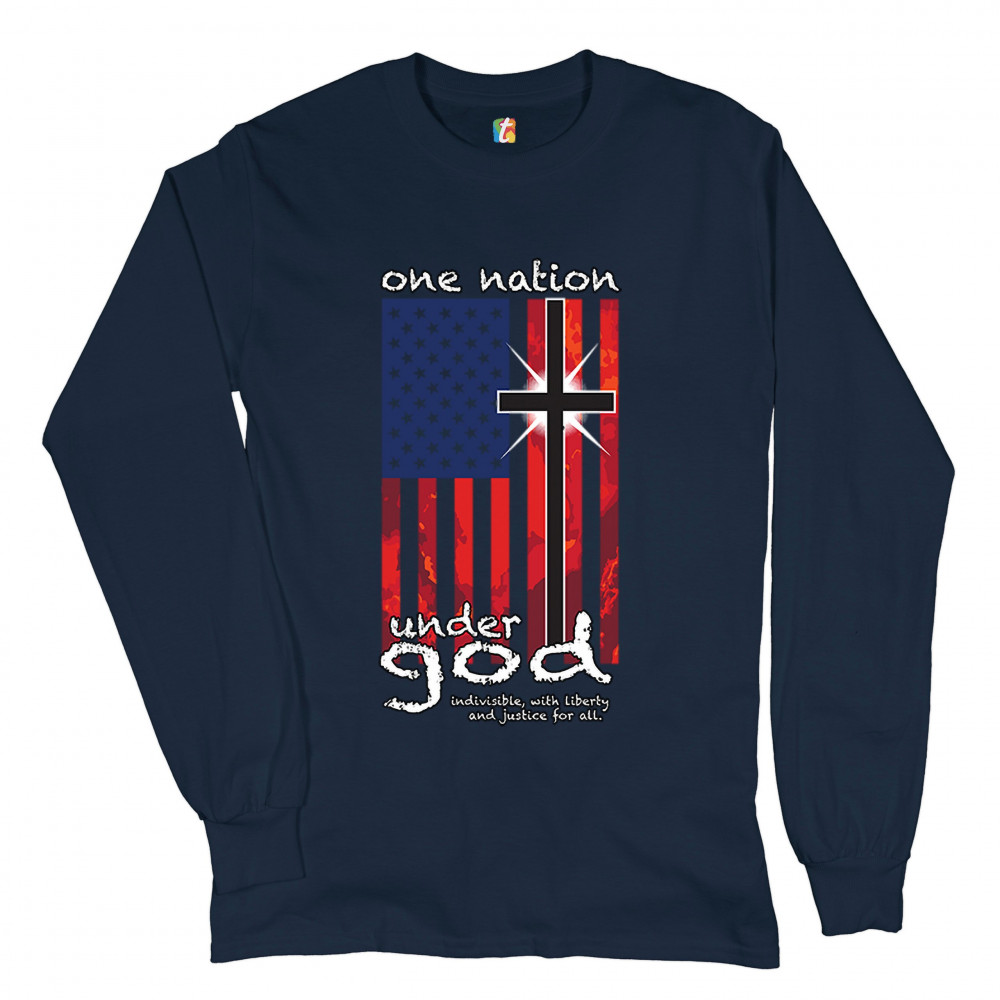 ONE NATION UNDER GOD long sleeve t-shirt usa american flag patriotic christian navy blue