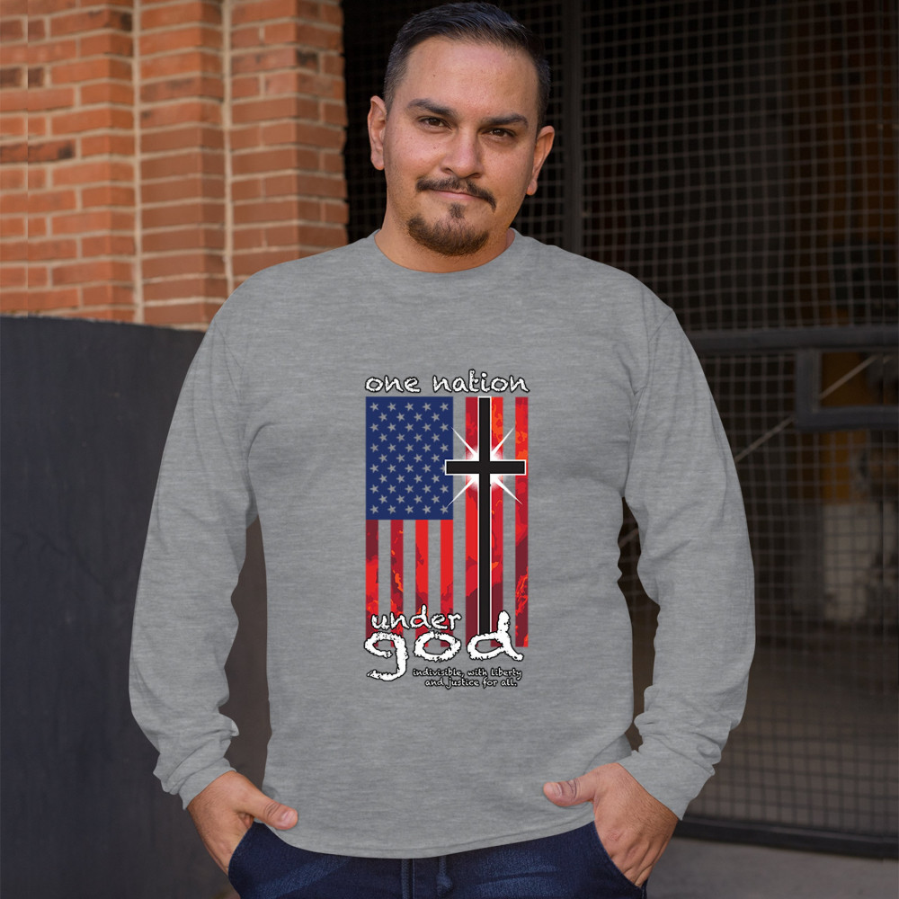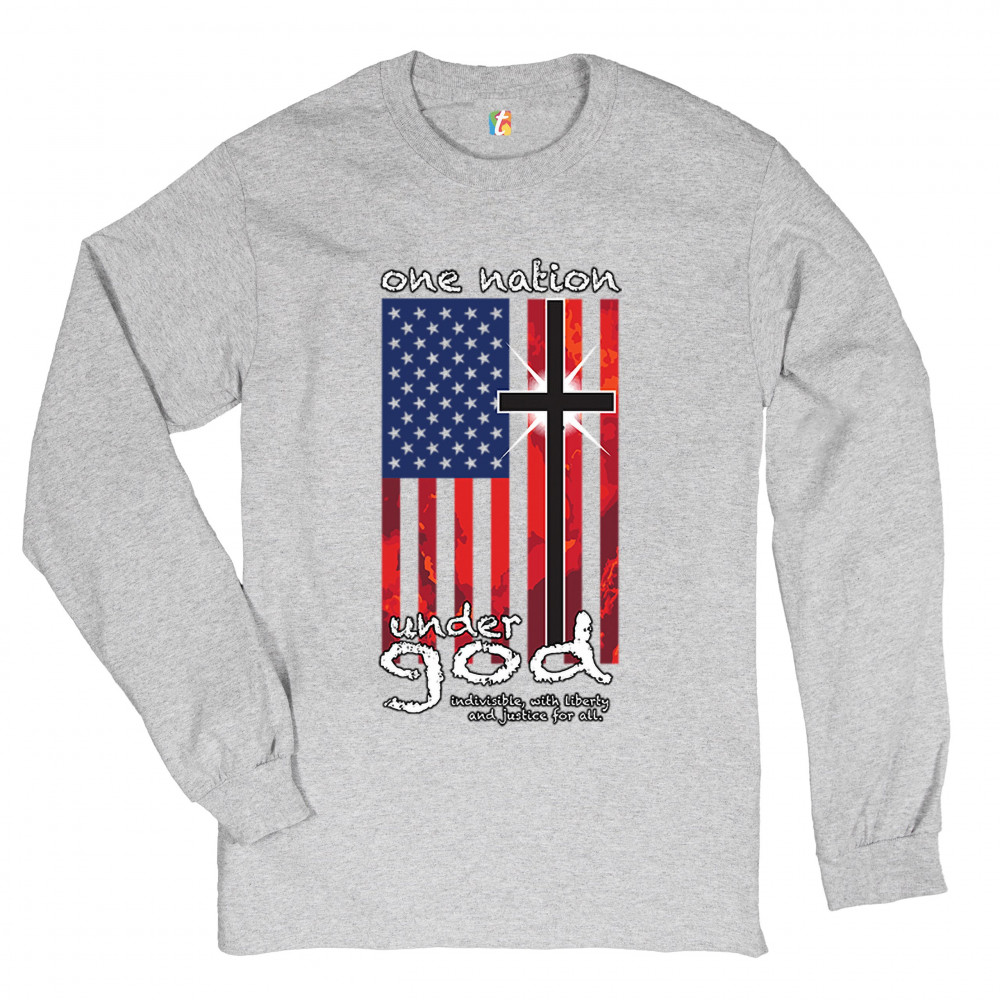 A patriotic print saying "One Nation Under God Indivisible, with Liberty and Justice for All" and featuring an American Flag with a cross instead of one of the stripes. Great choice for a religious person to wear on Independence Day or any other patriotic