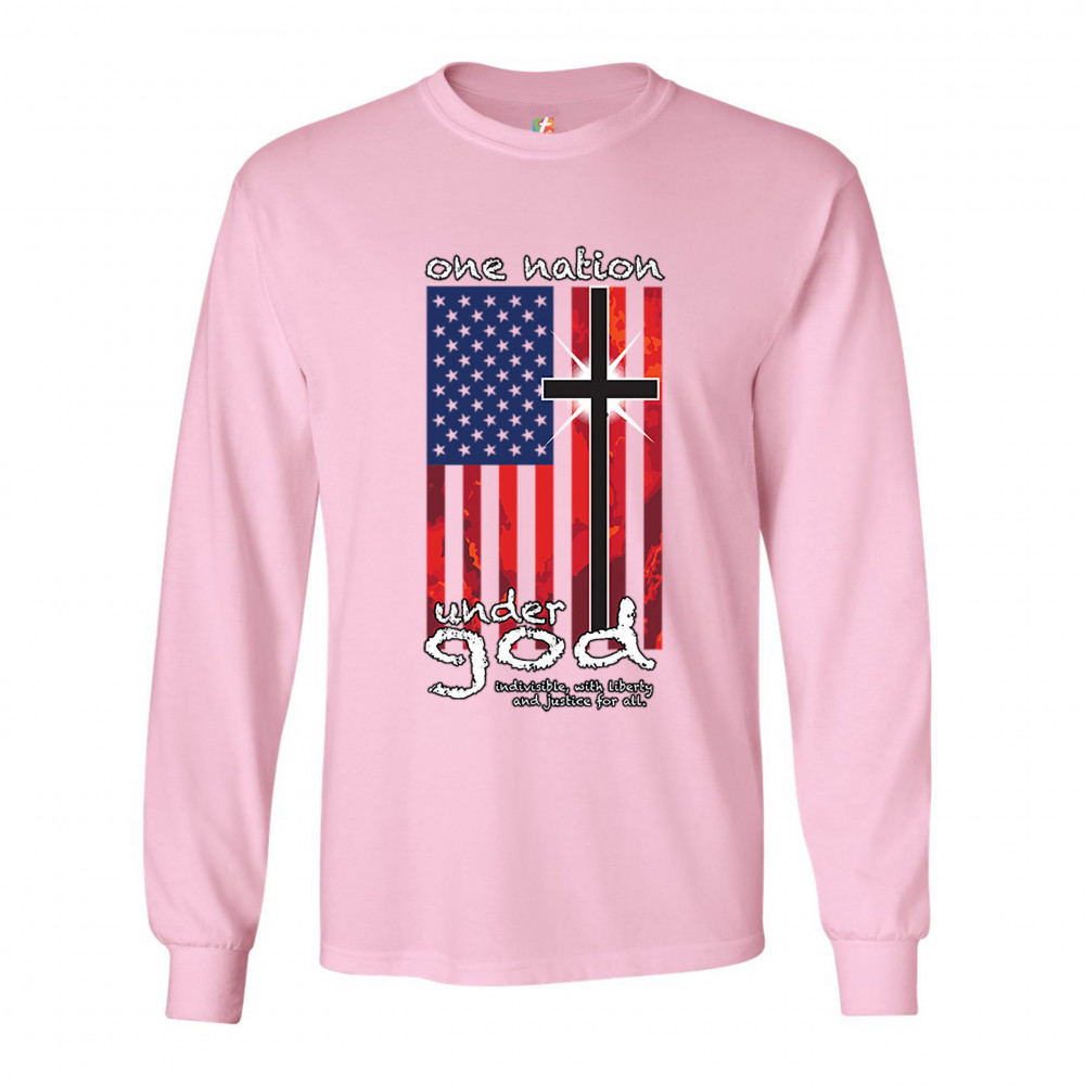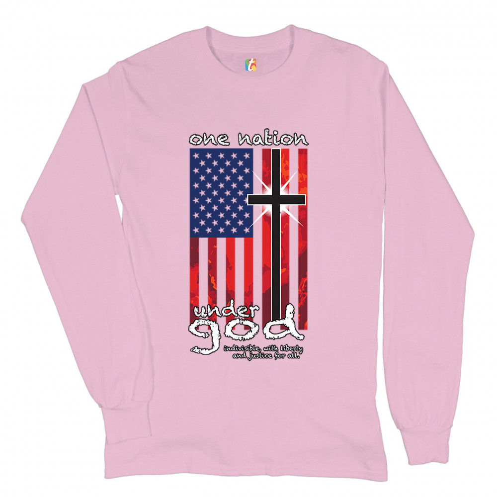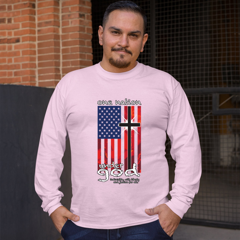 A patriotic print saying "One Nation Under God Indivisible, with Liberty and Justice for All" and featuring an American Flag with a cross instead of one of the stripes. Great choice for a religious person to wear on Independence Day or any other patriotic