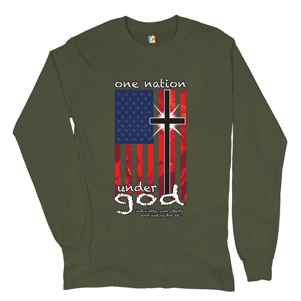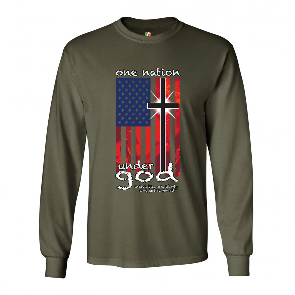 ONE NATION UNDER GOD long sleeve t-shirt usa american flag patriotic christian military green