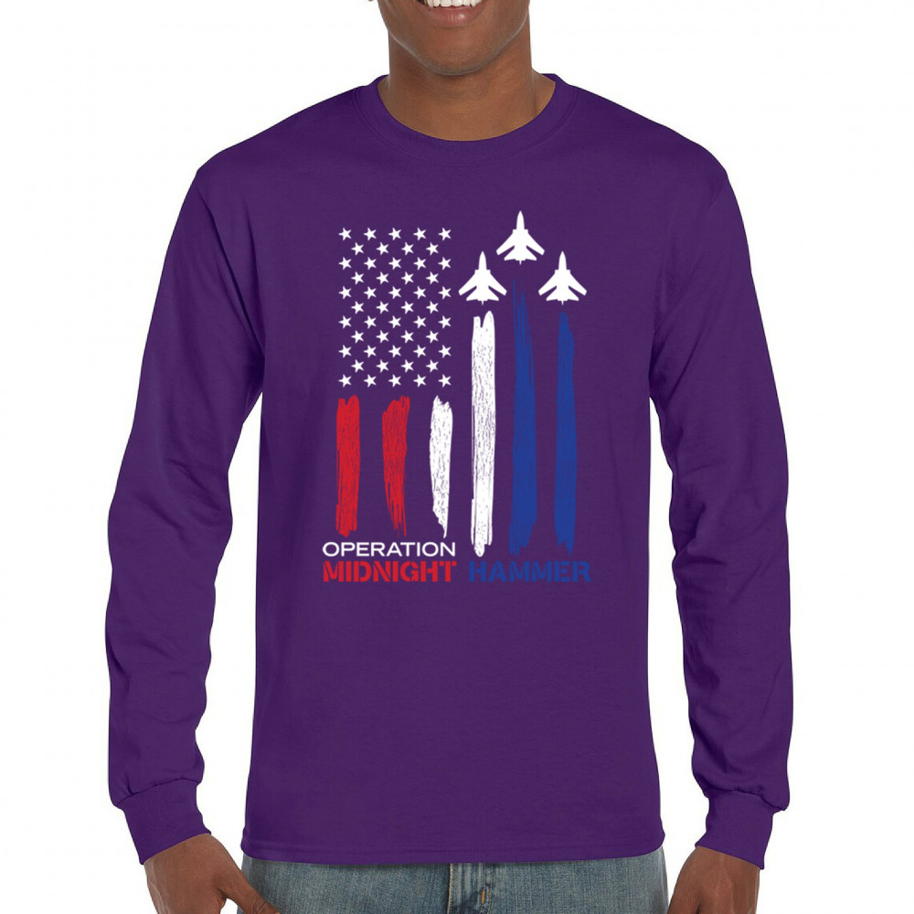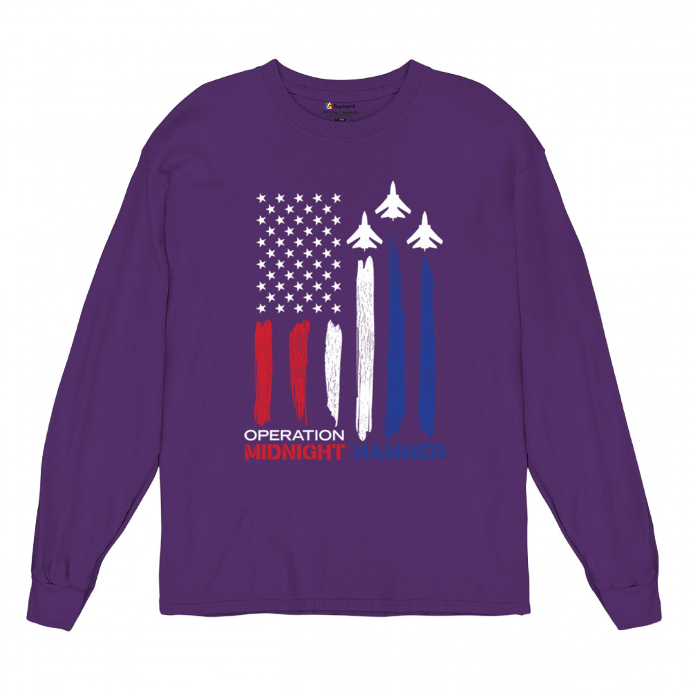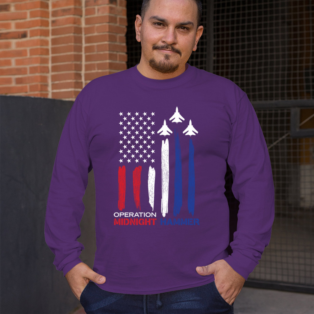 Operation Midnight Hammer design with jets and patriotic flag. Perfect for military pride, conservatives, and true America First supporters.