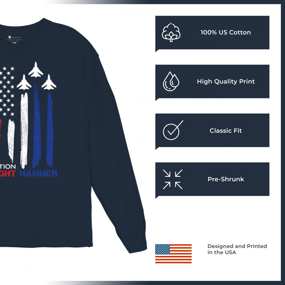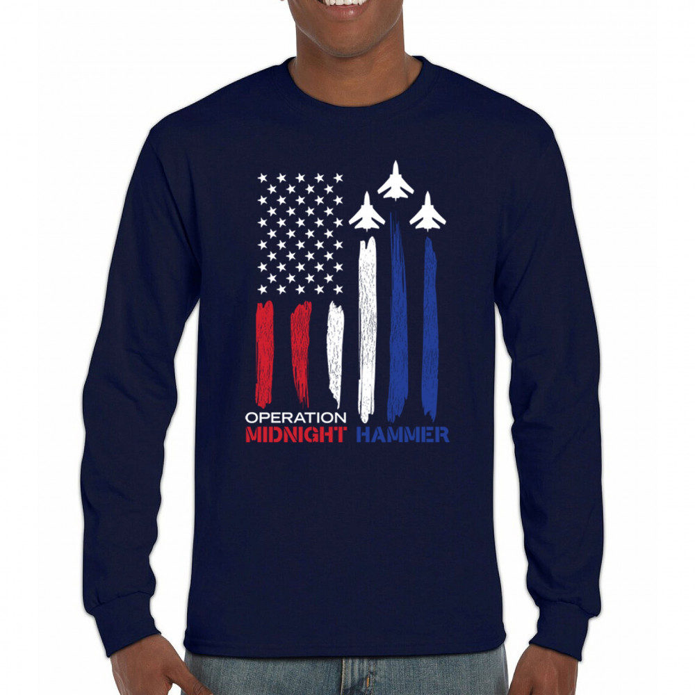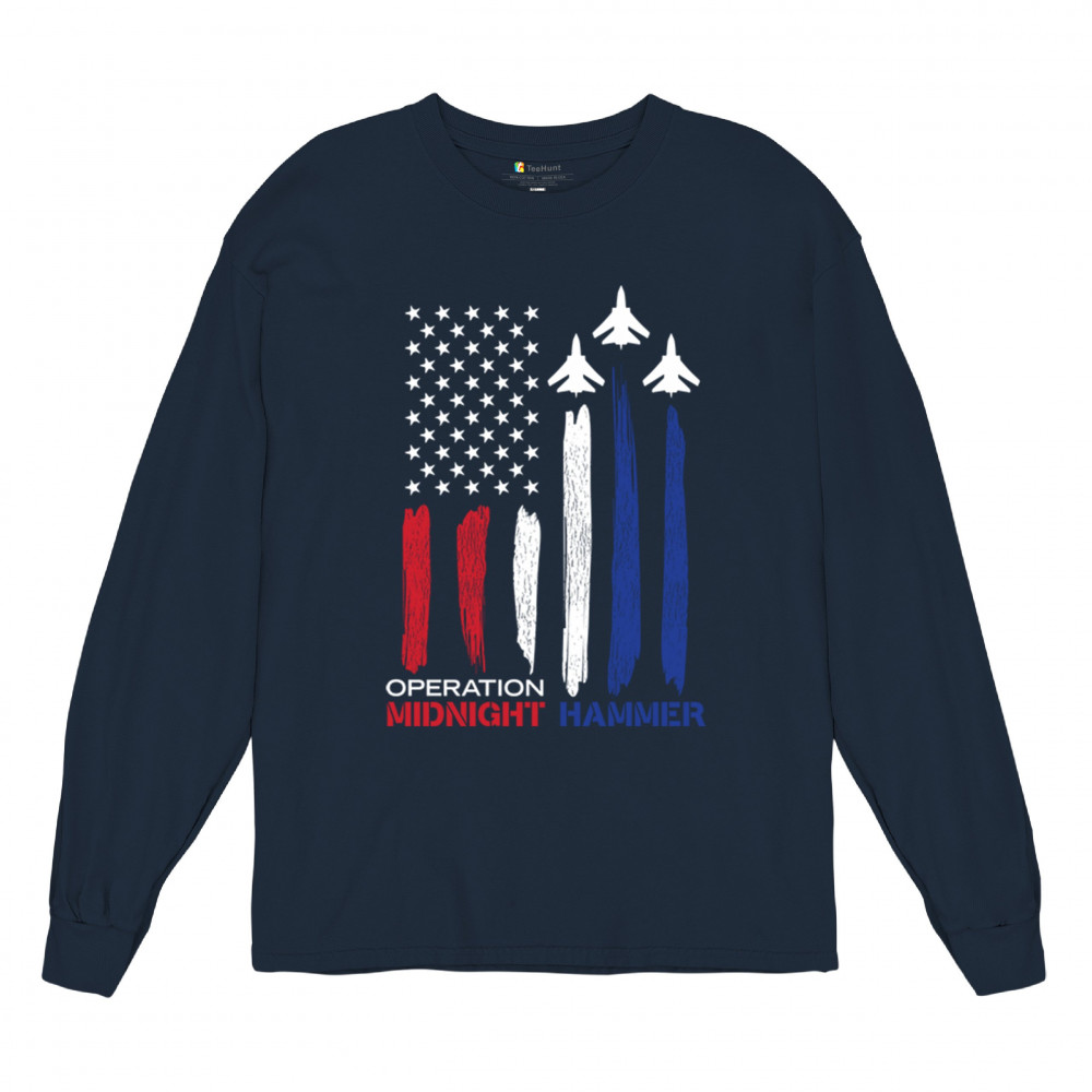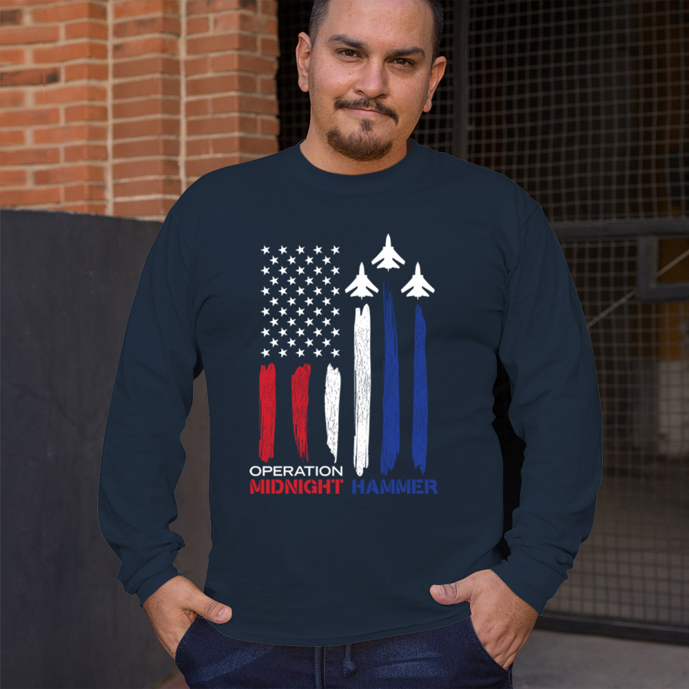 Operation Midnight Hammer design with jets and patriotic flag. Perfect for military pride, conservatives, and true America First supporters.