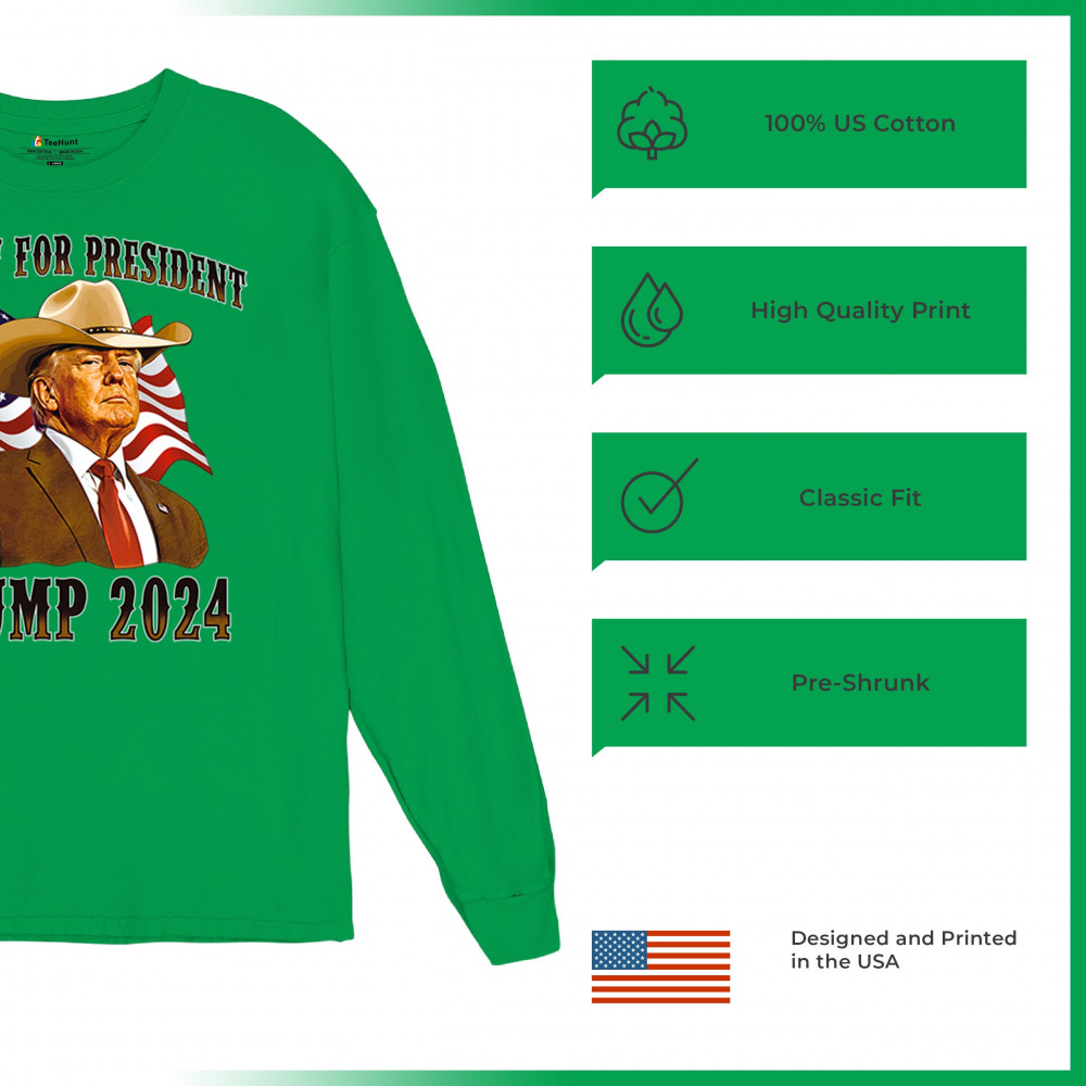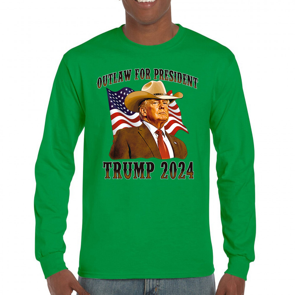 The "Outlaw for President" Trump 2024 design is a powerful symbol of American resilience and conservative pride. Featuring Donald J. Trump in a cowboy hat with the American flag waving behind, this design speaks to supporters who believe in the America First movement, conservative values, and a rebel spirit. Ideal for rallies, patriotic events, and anyone looking to make a bold statement for the 47th President of the United States.
