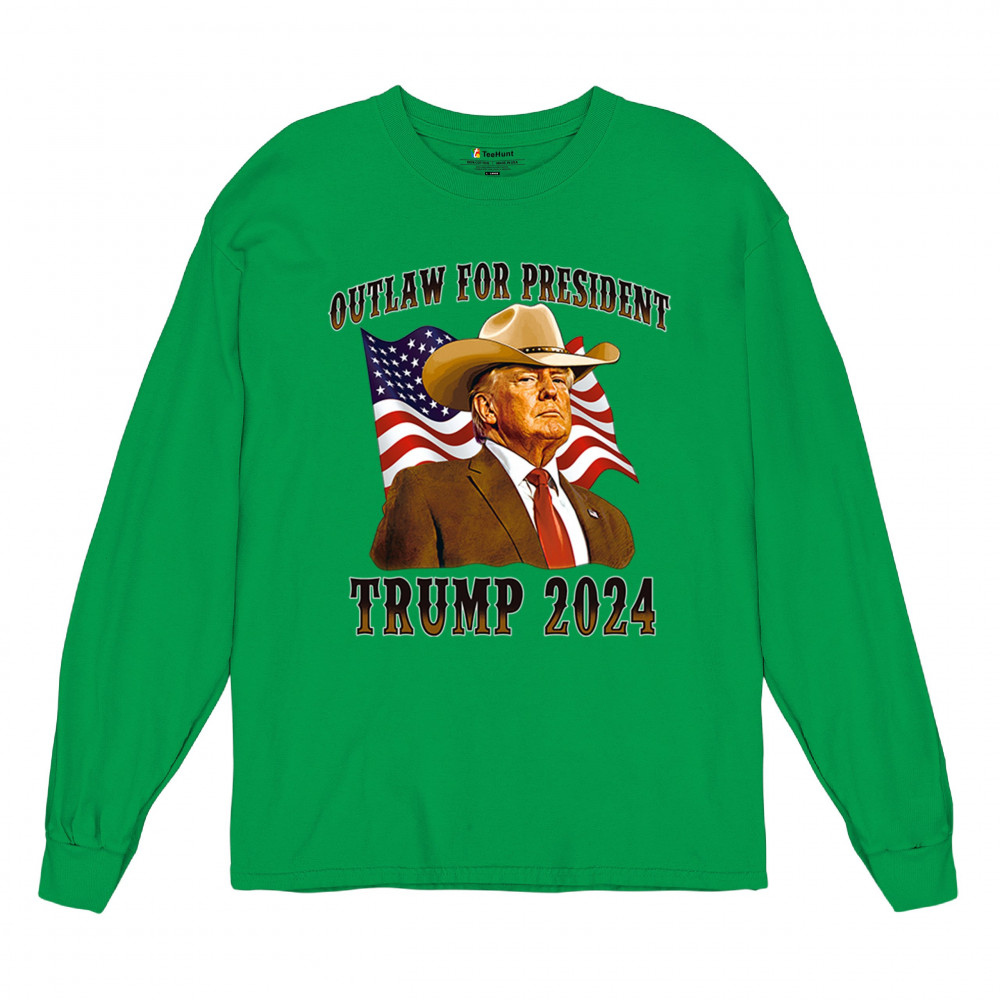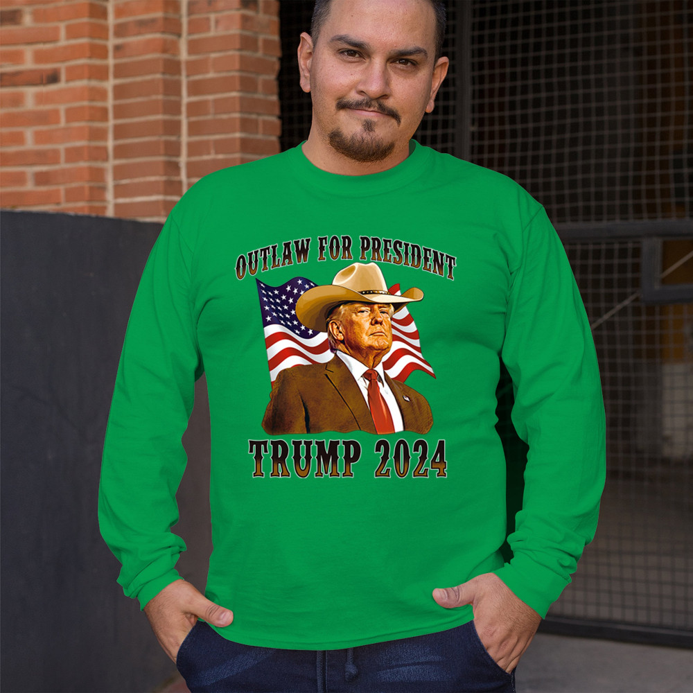 Bold "Outlaw for President" Trump 2024 design for conservative supporters, featuring Donald J. Trump and the American flag. Show your patriotism.