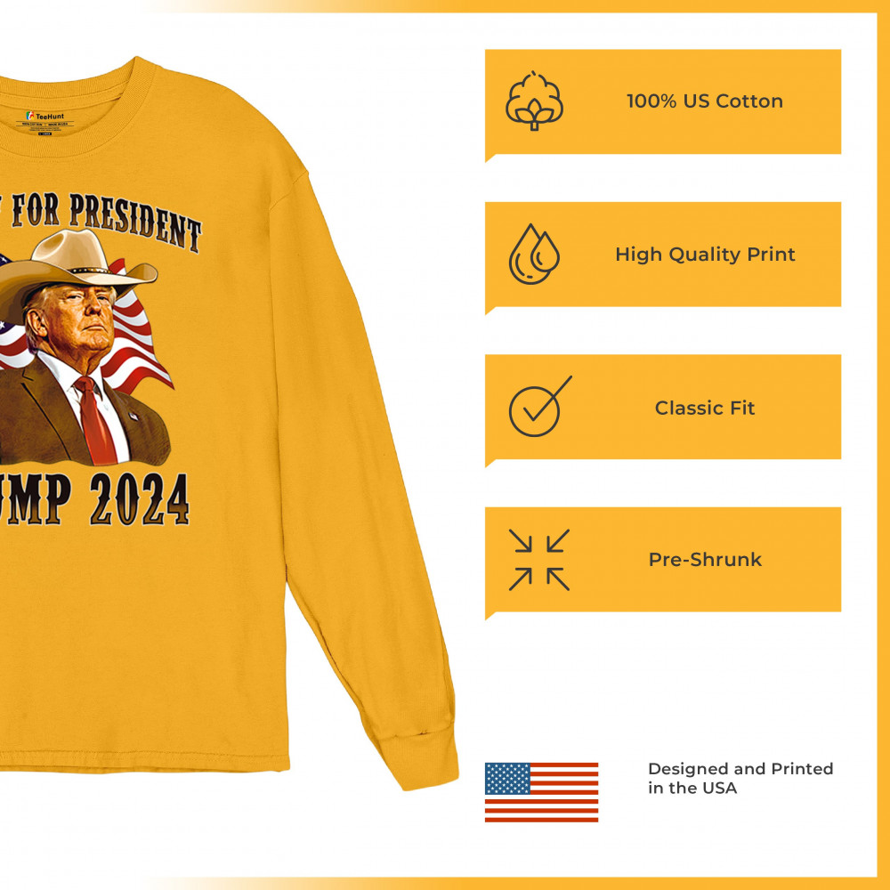 The "Outlaw for President" Trump 2024 design is a powerful symbol of American resilience and conservative pride. Featuring Donald J. Trump in a cowboy hat with the American flag waving behind, this design speaks to supporters who believe in the America First movement, conservative values, and a rebel spirit. Ideal for rallies, patriotic events, and anyone looking to make a bold statement for the 47th President of the United States.