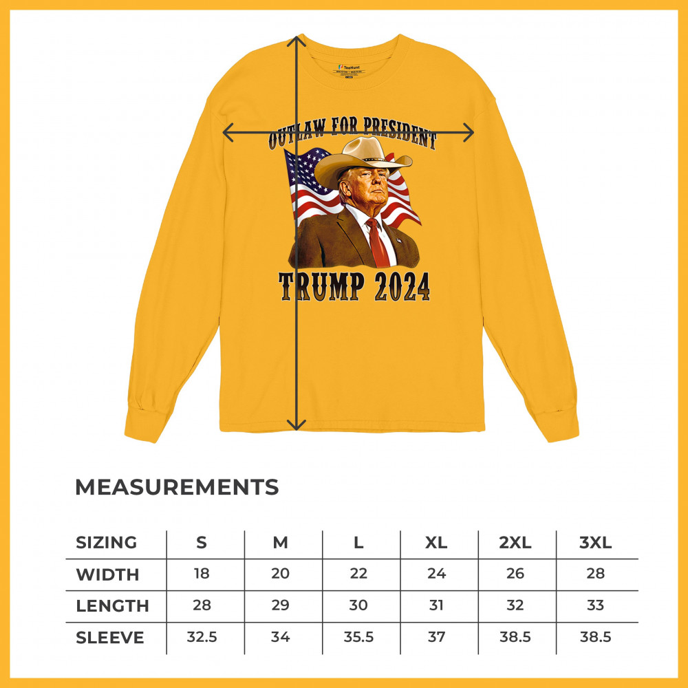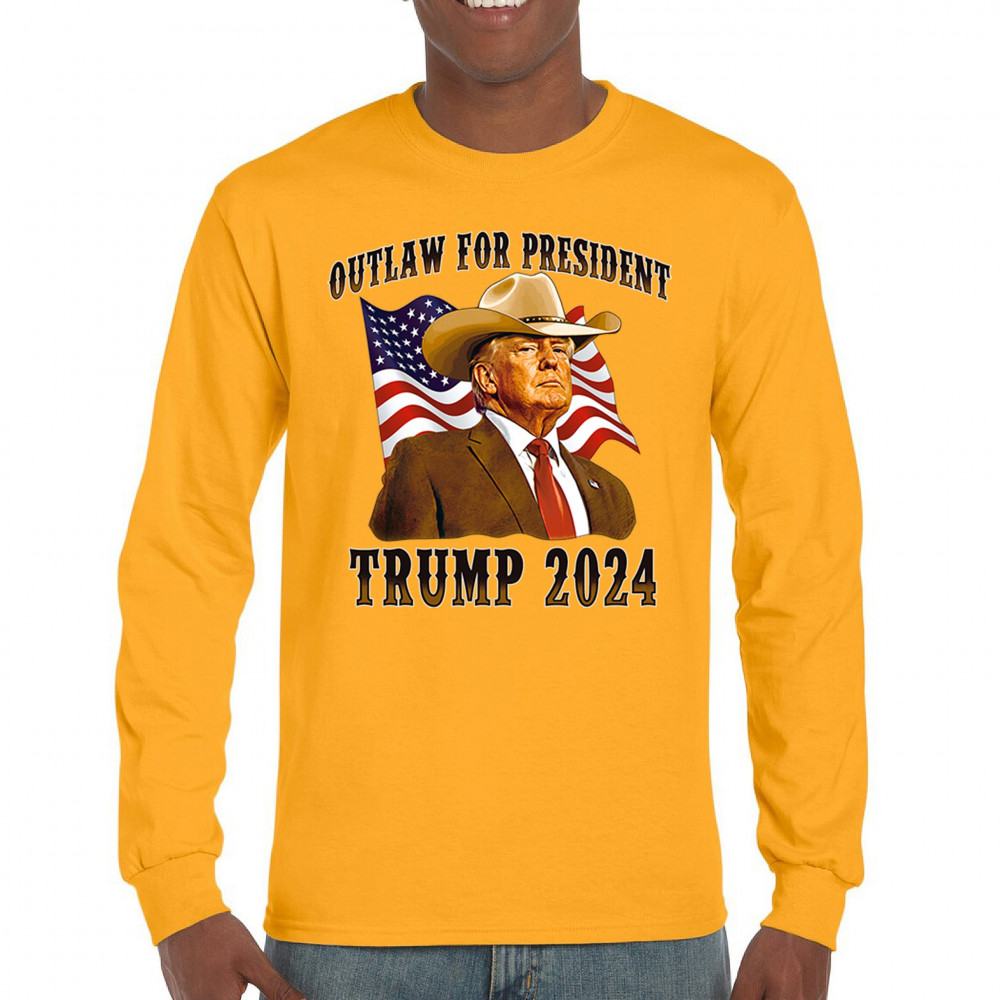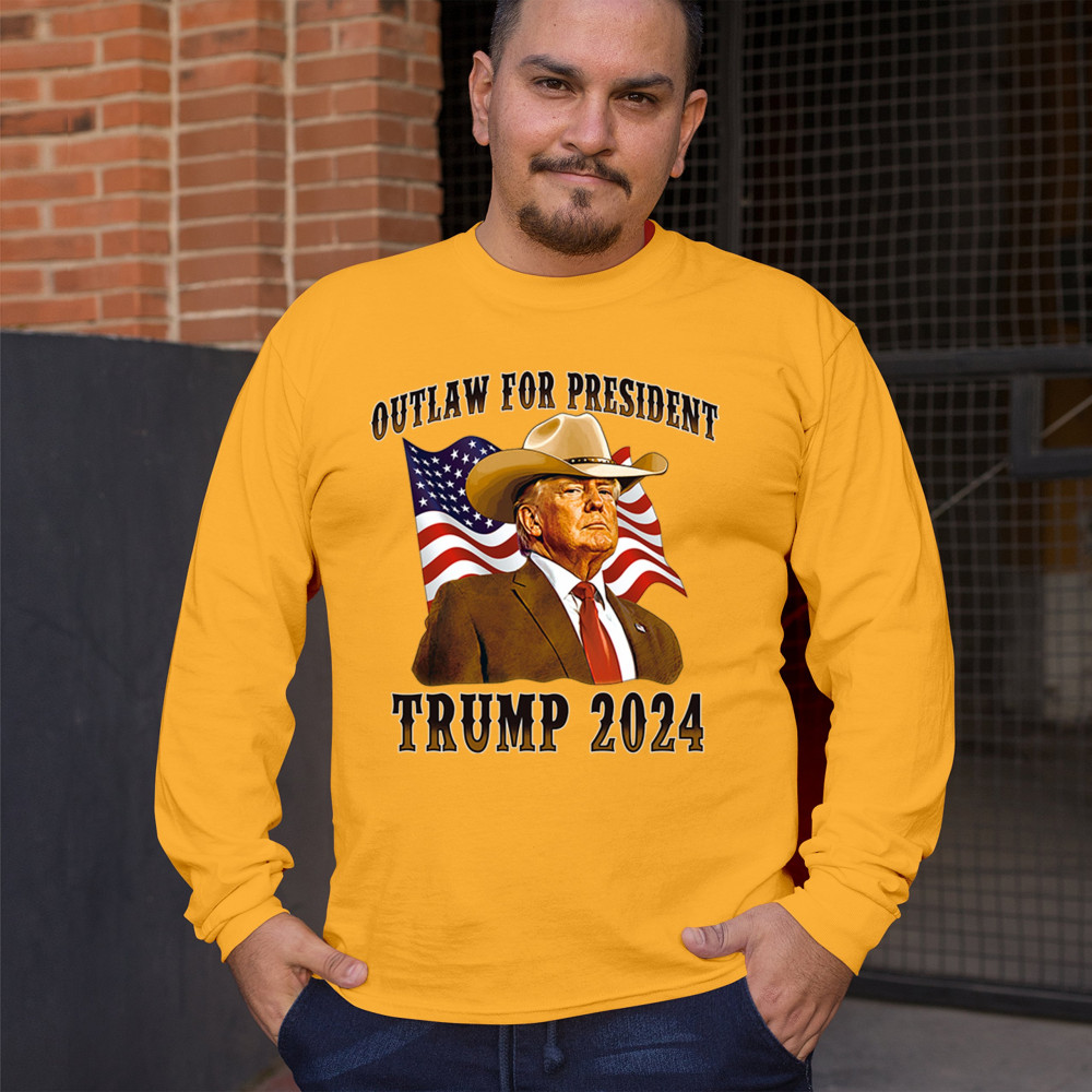 Bold "Outlaw for President" Trump 2024 design for conservative supporters, featuring Donald J. Trump and the American flag. Show your patriotism.