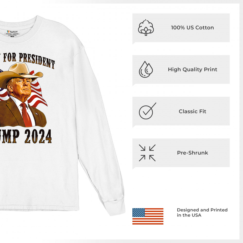 The "Outlaw for President" Trump 2024 design is a powerful symbol of American resilience and conservative pride. Featuring Donald J. Trump in a cowboy hat with the American flag waving behind, this design speaks to supporters who believe in the America First movement, conservative values, and a rebel spirit. Ideal for rallies, patriotic events, and anyone looking to make a bold statement for the 47th President of the United States.