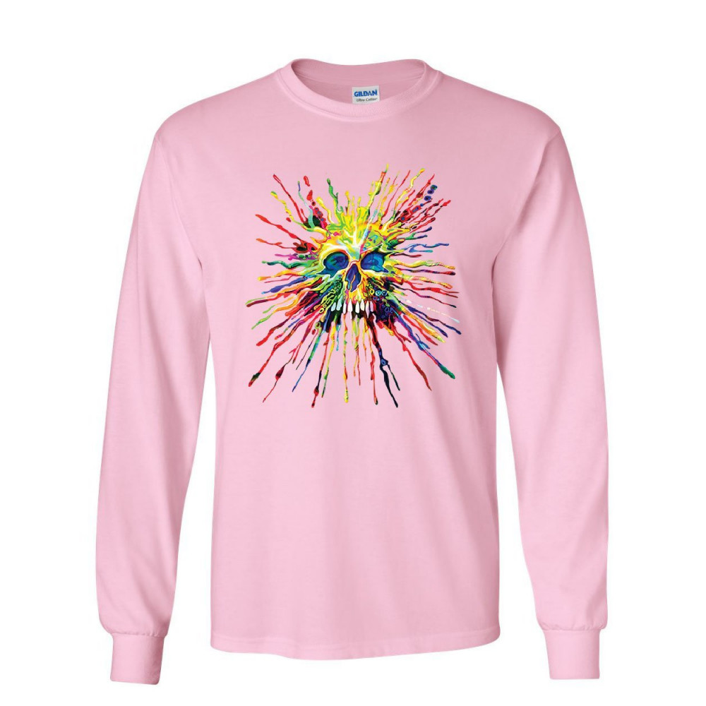 PAINT SPLATTER SKULL long sleeve t-shirt multicolor art crazy melting drip tee light pink