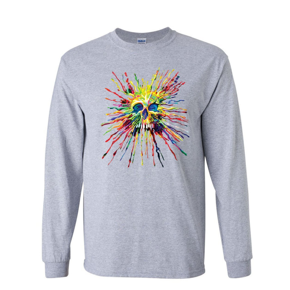 PAINT SPLATTER SKULL long sleeve t-shirt multicolor art crazy melting drip tee gray