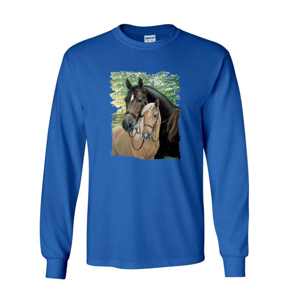PAIR OF HORSES long sleeve t-shirt mustangs horseback riding pony stallion tee royal blue
