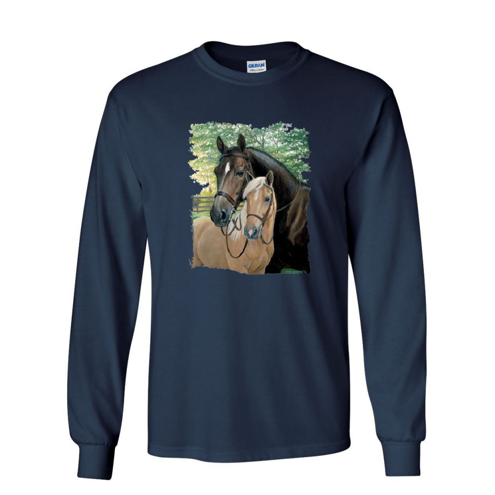 PAIR OF HORSES long sleeve t-shirt mustangs horseback riding pony stallion tee navy blue