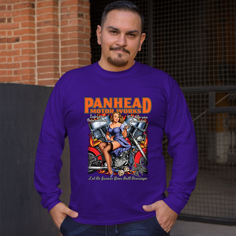 A print featuring a sexy pin-up girl sitting on a chopper motorcycle holding a wrench. In the background there is a V-engine. The print says: "Panhead motor works, Lubrication boring and stroking, Full service available, Let us grease your ball bearings".