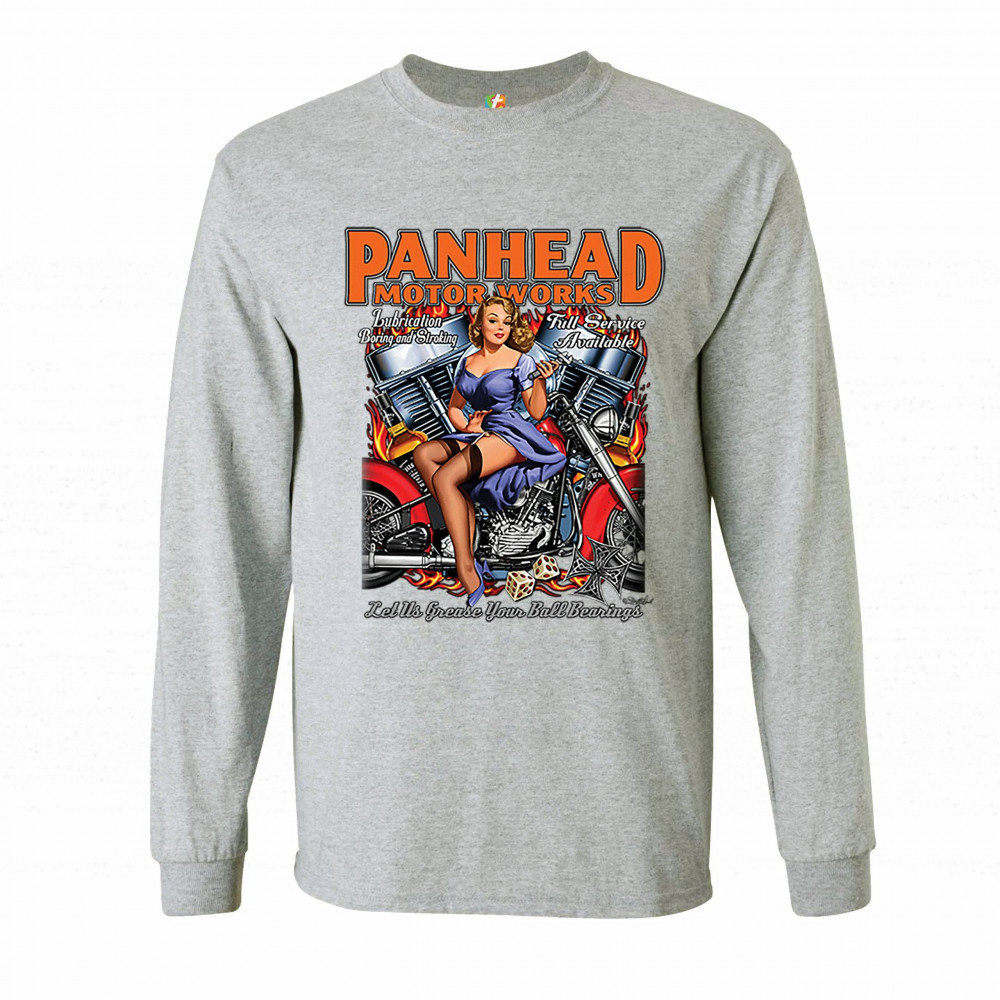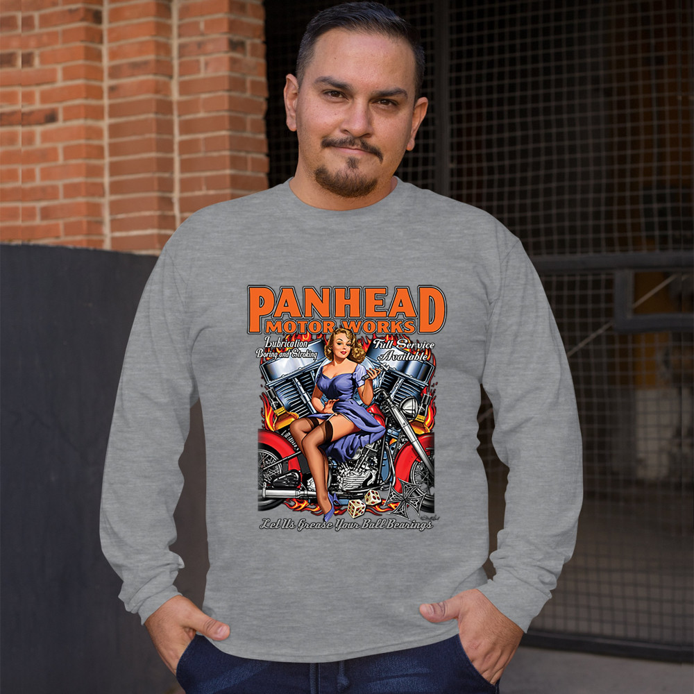 A print featuring a sexy pin-up girl sitting on a chopper motorcycle holding a wrench. In the background there is a V-engine. The print says: "Panhead motor works, Lubrication boring and stroking, Full service available, Let us grease your ball bearings".