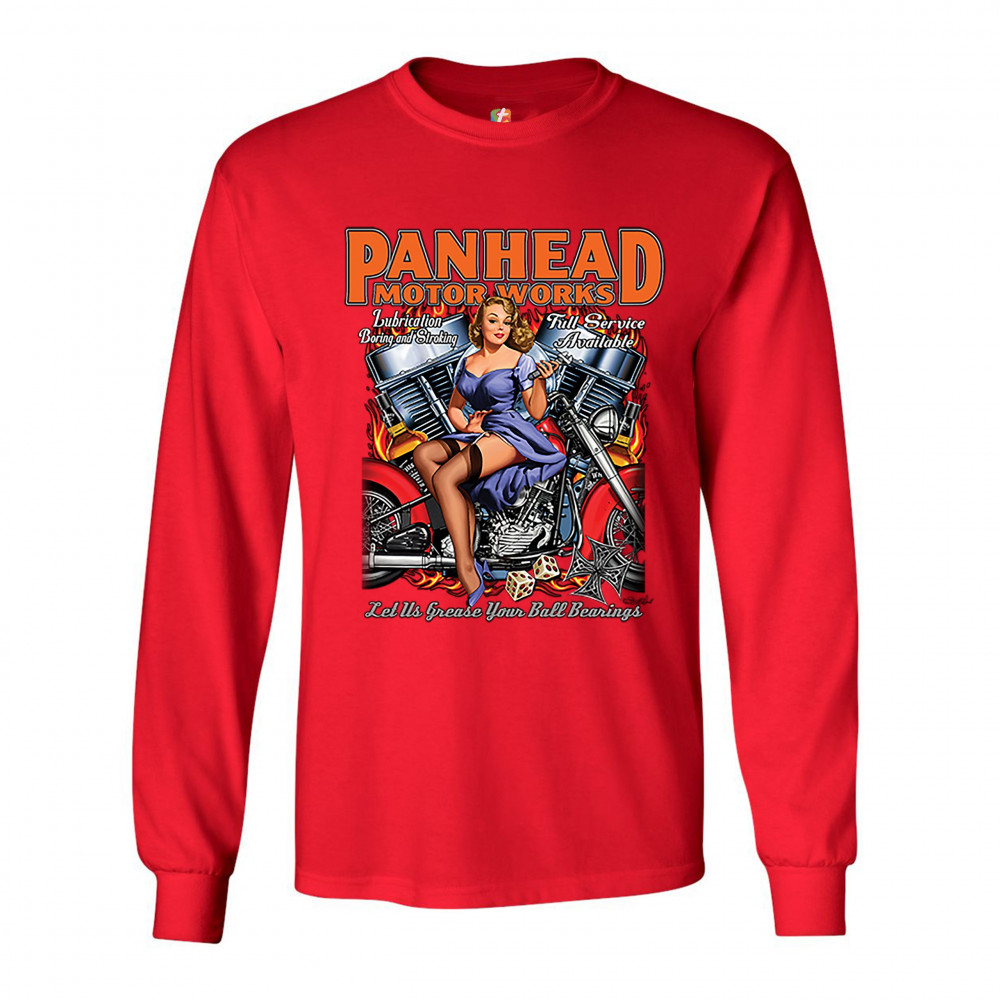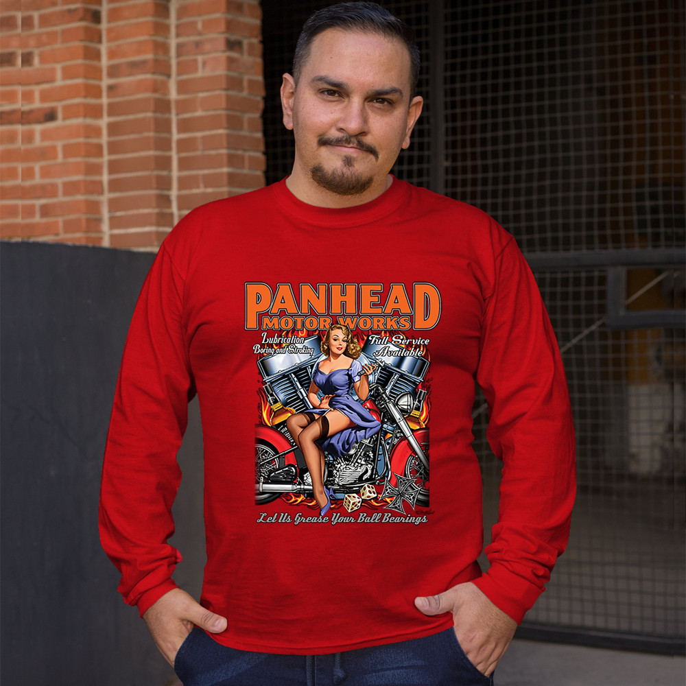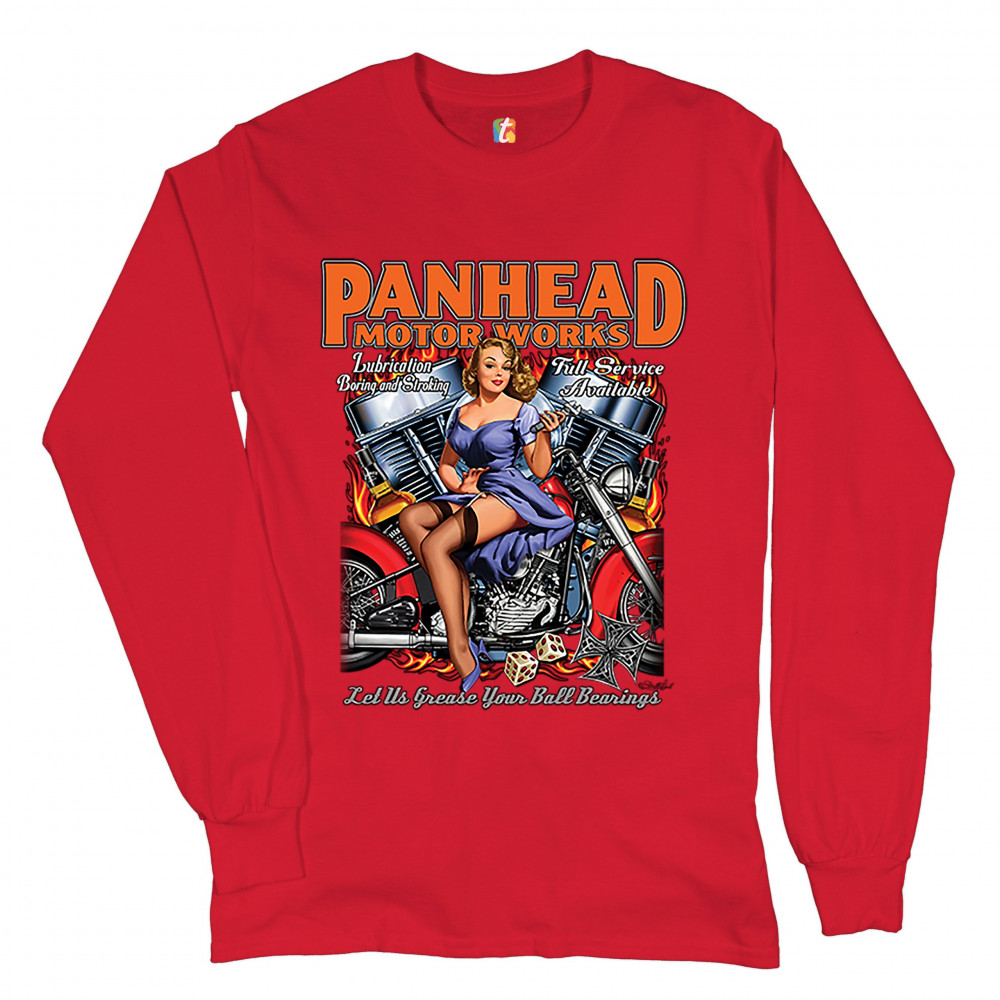 A print featuring a sexy pin-up girl sitting on a chopper motorcycle holding a wrench. In the background there is a V-engine. The print says: "Panhead motor works, Lubrication boring and stroking, Full service available, Let us grease your ball bearings".