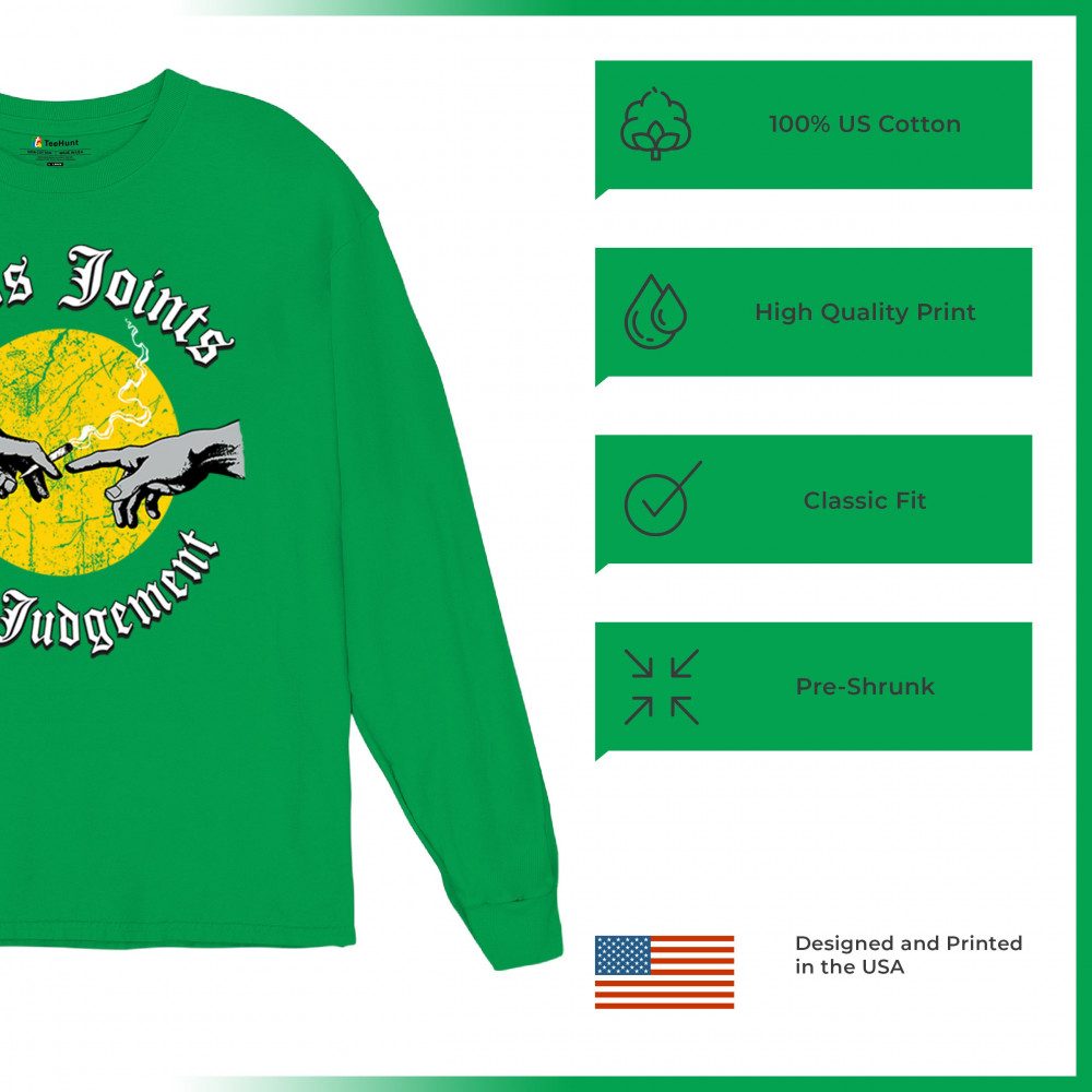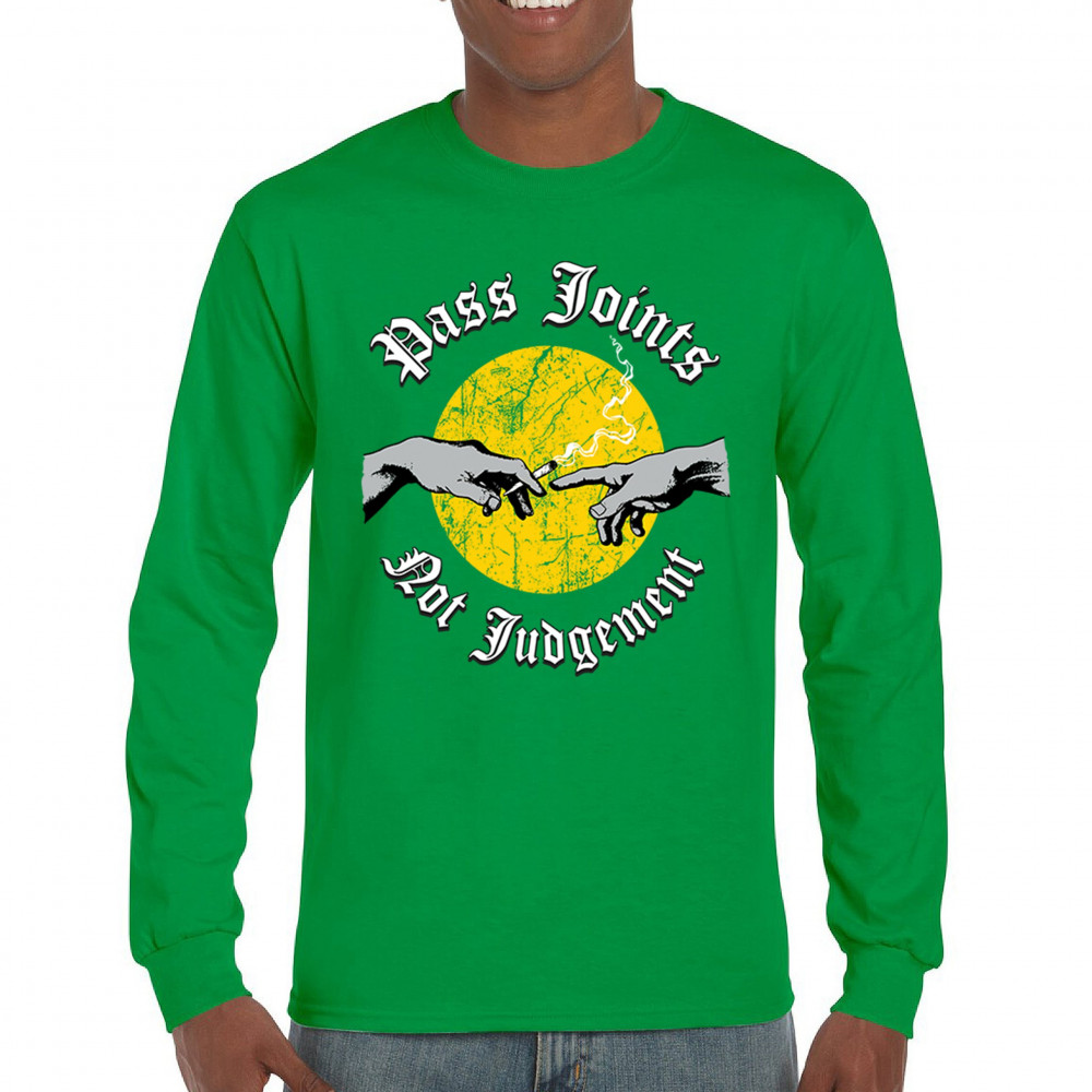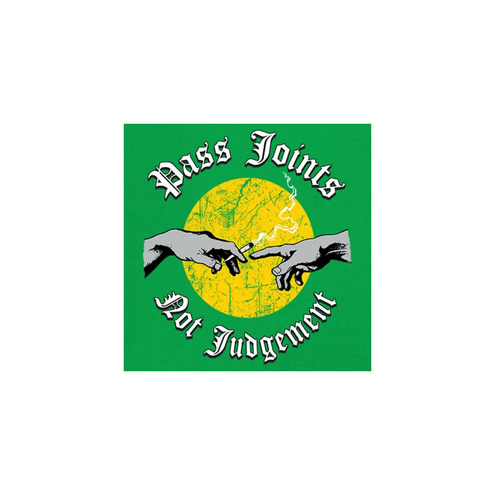 Cannabis culture twist on classic art. Hands passing a joint with “Pass Joints Not Judgement†message. Chill, bold, and unapologetically stoner.