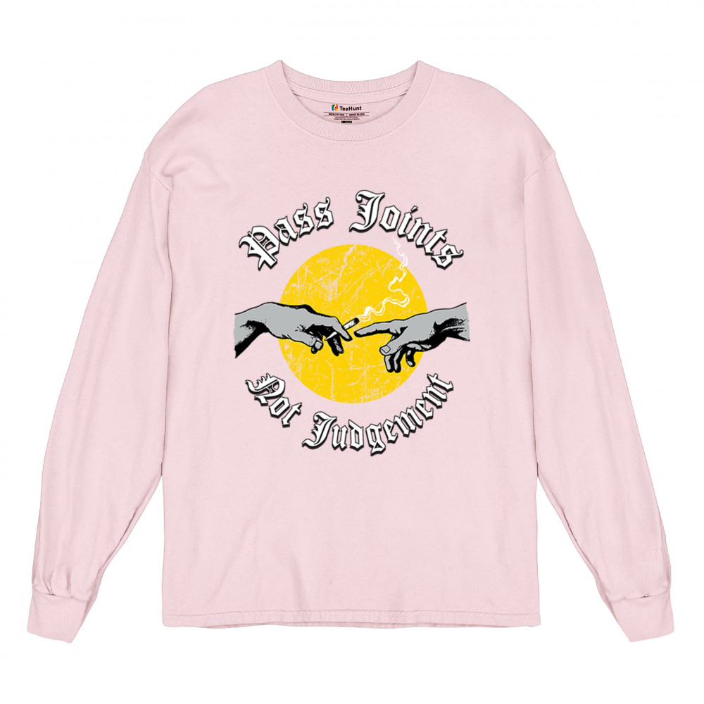 Cannabis culture twist on classic art. Hands passing a joint with “Pass Joints Not Judgement†message. Chill, bold, and unapologetically stoner.