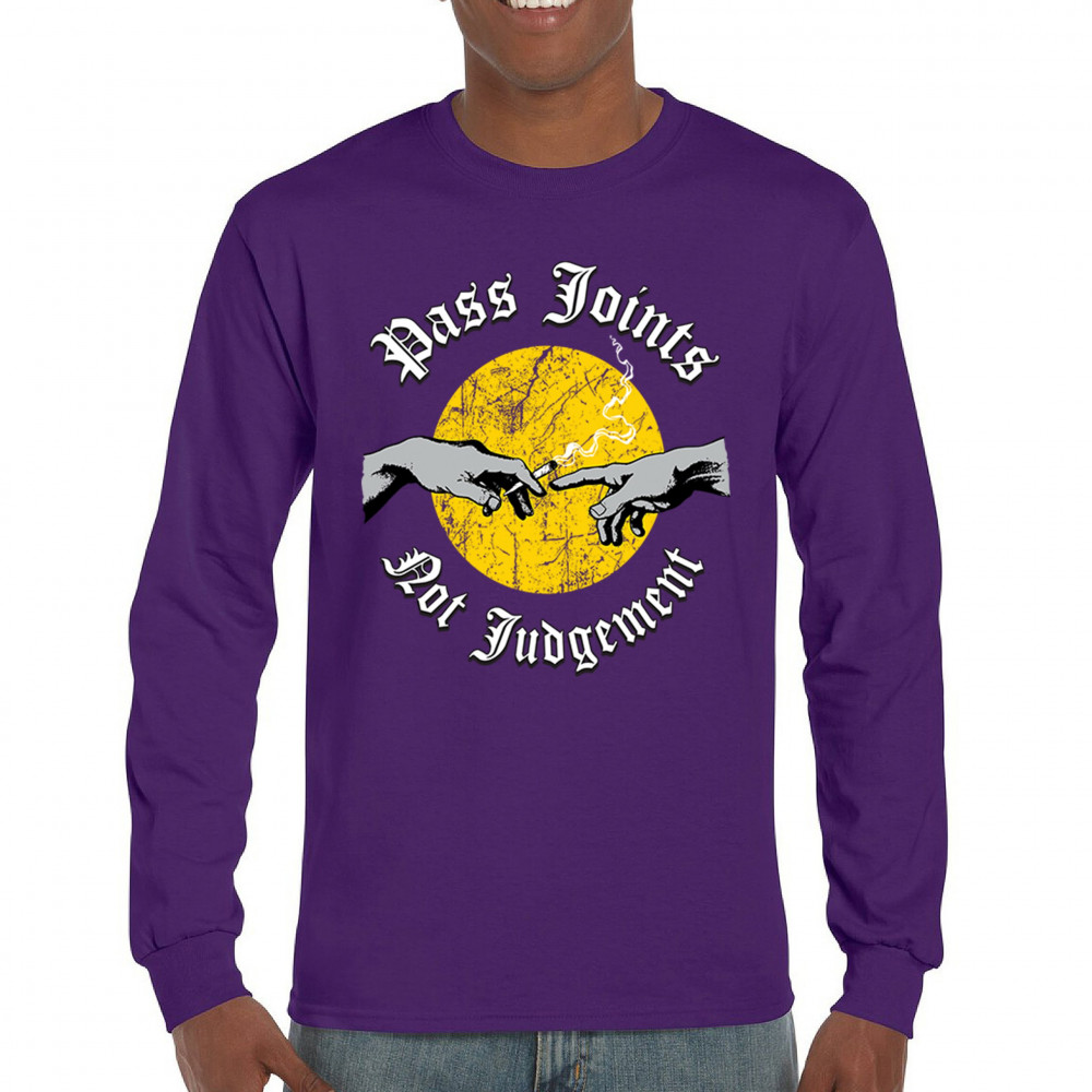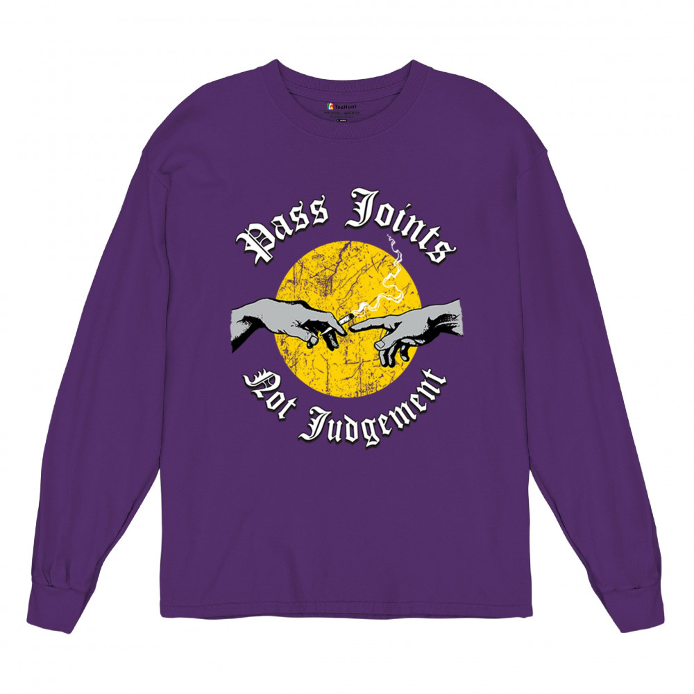 Cannabis culture twist on classic art. Hands passing a joint with “Pass Joints Not Judgement†message. Chill, bold, and unapologetically stoner.