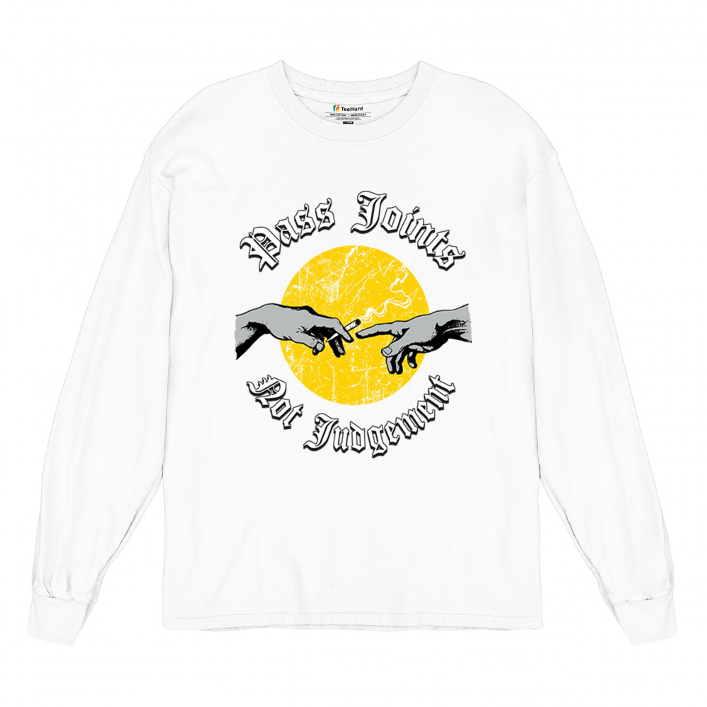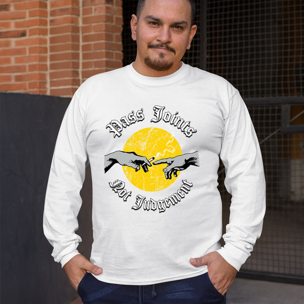 Cannabis culture twist on classic art. Hands passing a joint with “Pass Joints Not Judgement†message. Chill, bold, and unapologetically stoner.