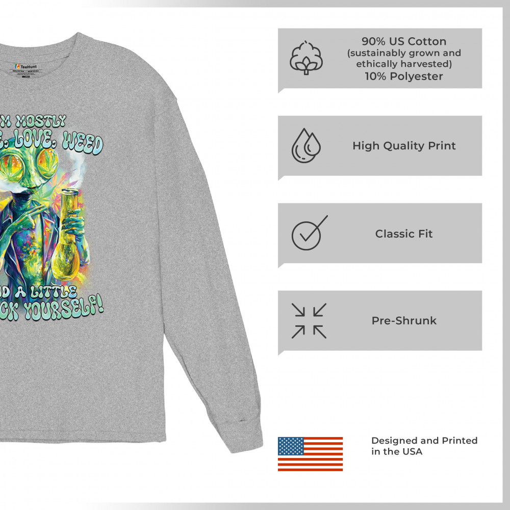 This bold alien stoner design fuses colorful weed art with raw honesty and stoner attitude. Featuring a high alien and vibrant peace love weed vibe, it's perfect for unapologetic smokers who blend kindness and truth. Wear it at festivals, smoke sessions, or whenever your mood is 80% peace, 20% sarcasm. It’s humor, cannabis culture, and bold energy rolled into one.