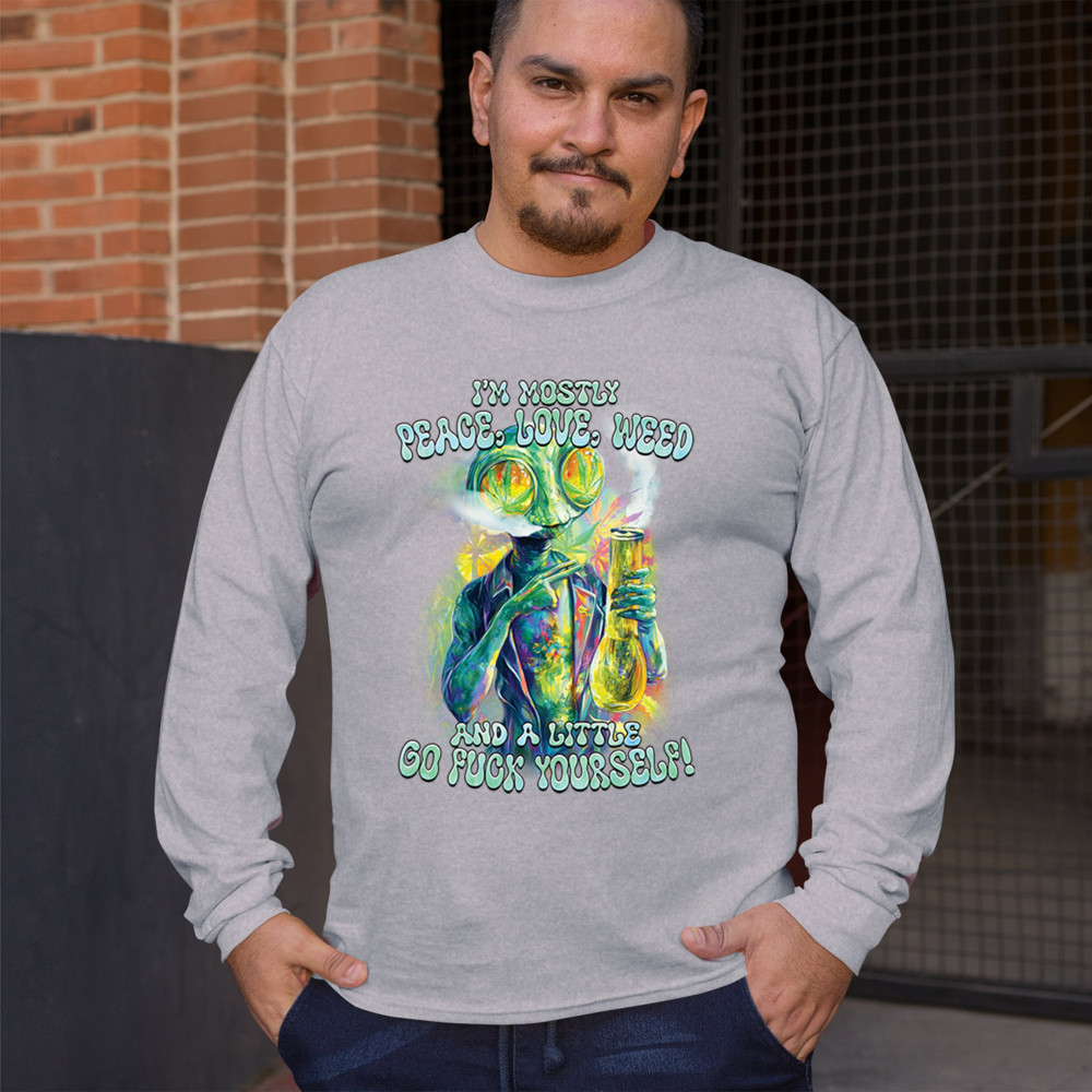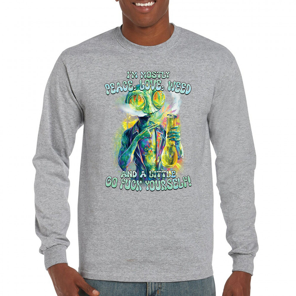 Bold alien cannabis design mixing humor, sarcasm, and weed culture—perfect for unapologetic smokers with attitude and peace vibes.