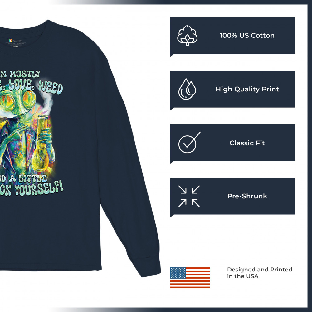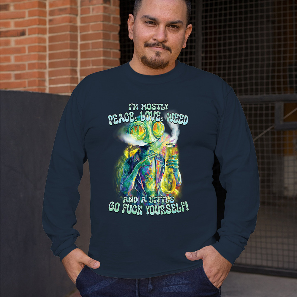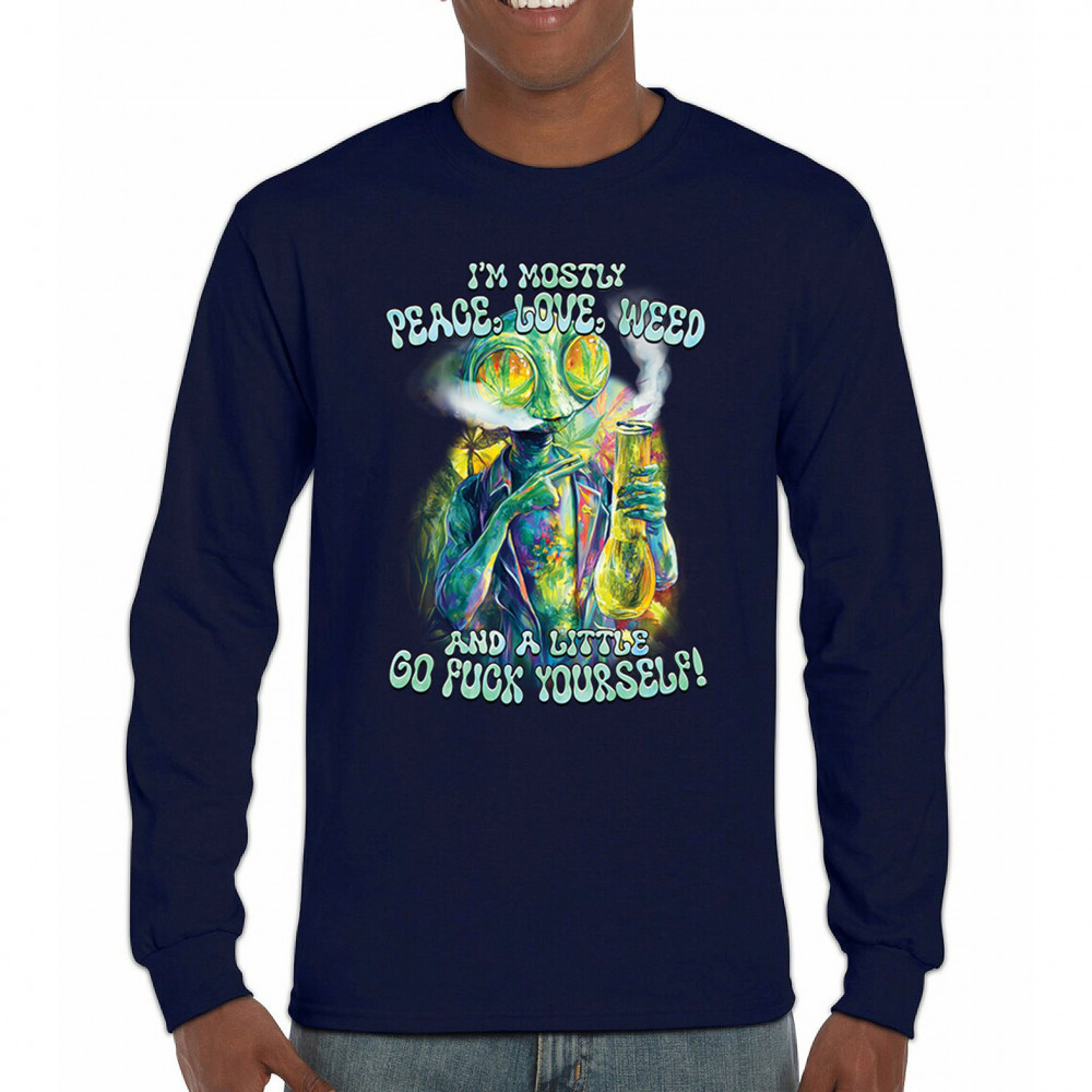This bold alien stoner design fuses colorful weed art with raw honesty and stoner attitude. Featuring a high alien and vibrant peace love weed vibe, it's perfect for unapologetic smokers who blend kindness and truth. Wear it at festivals, smoke sessions, or whenever your mood is 80% peace, 20% sarcasm. It’s humor, cannabis culture, and bold energy rolled into one.