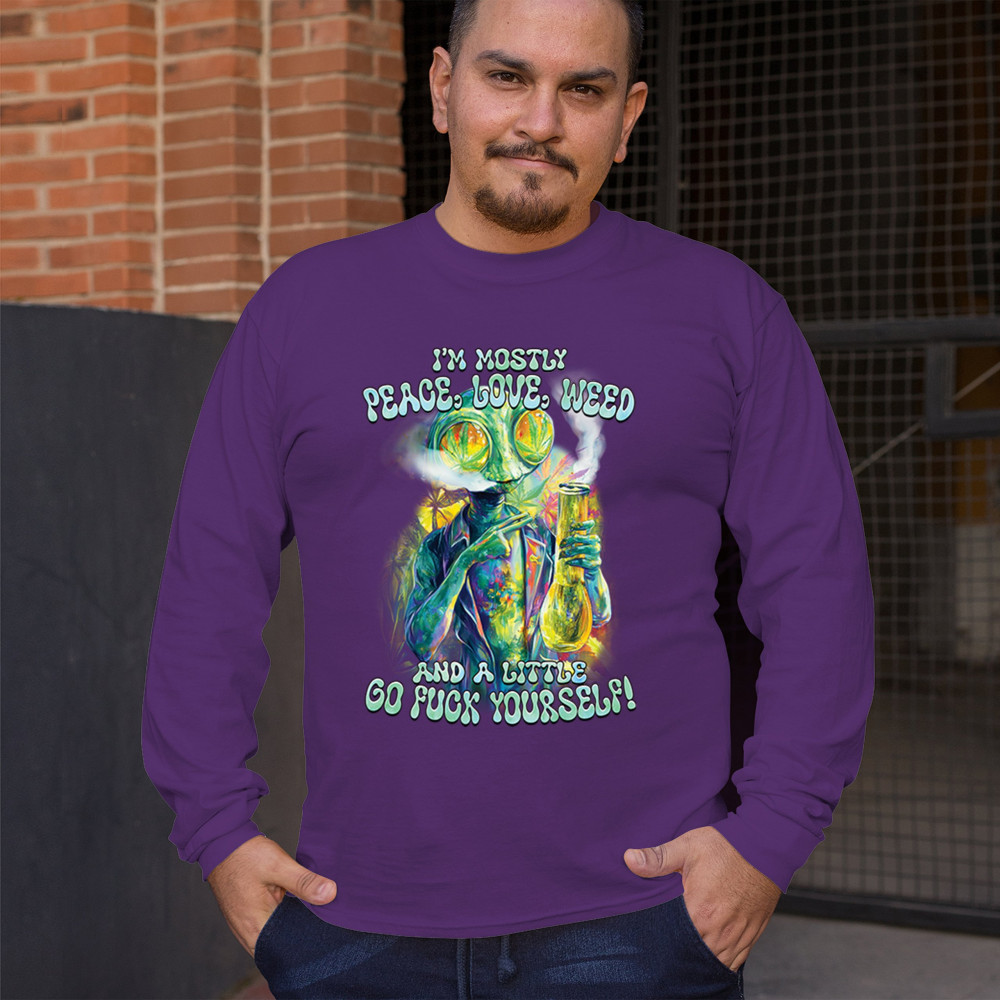 This bold alien stoner design fuses colorful weed art with raw honesty and stoner attitude. Featuring a high alien and vibrant peace love weed vibe, it's perfect for unapologetic smokers who blend kindness and truth. Wear it at festivals, smoke sessions, or whenever your mood is 80% peace, 20% sarcasm. It’s humor, cannabis culture, and bold energy rolled into one.