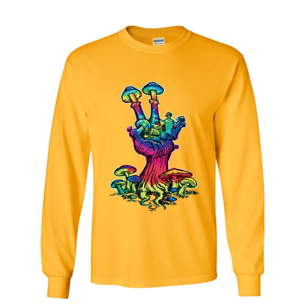 MUSHROOM PEACE peace mushroom long sleeve t-shirt shroom hippie fungi colorful neon love tee yellow