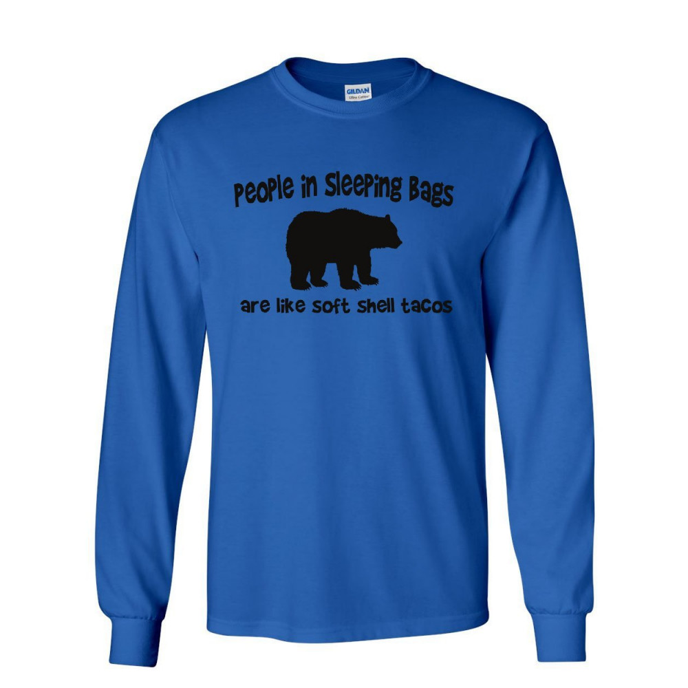 PEOPLE ARE SOFT SHELL TACOS long sleeve t-shirt funny camping brown bear tee royal blue