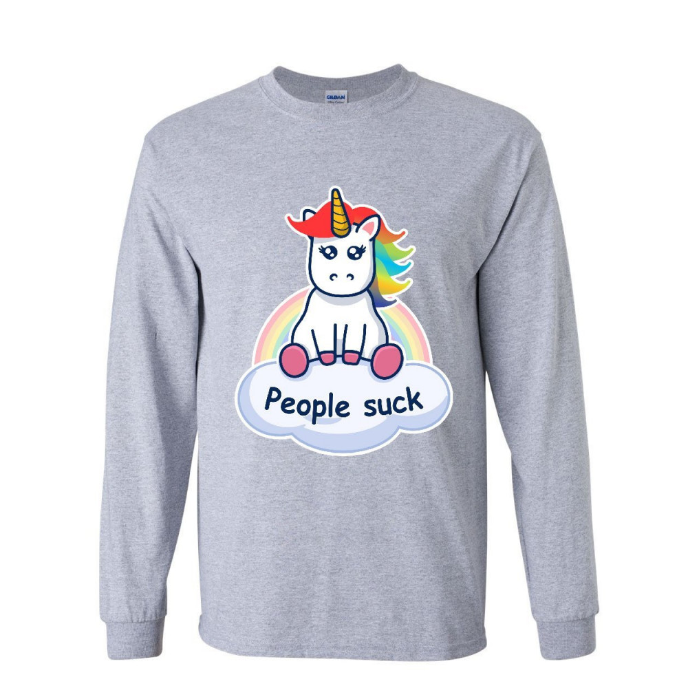 PEOPLE SUCK cute unicorn long sleeve t-shirt funny rainbow pony introvert tee gray