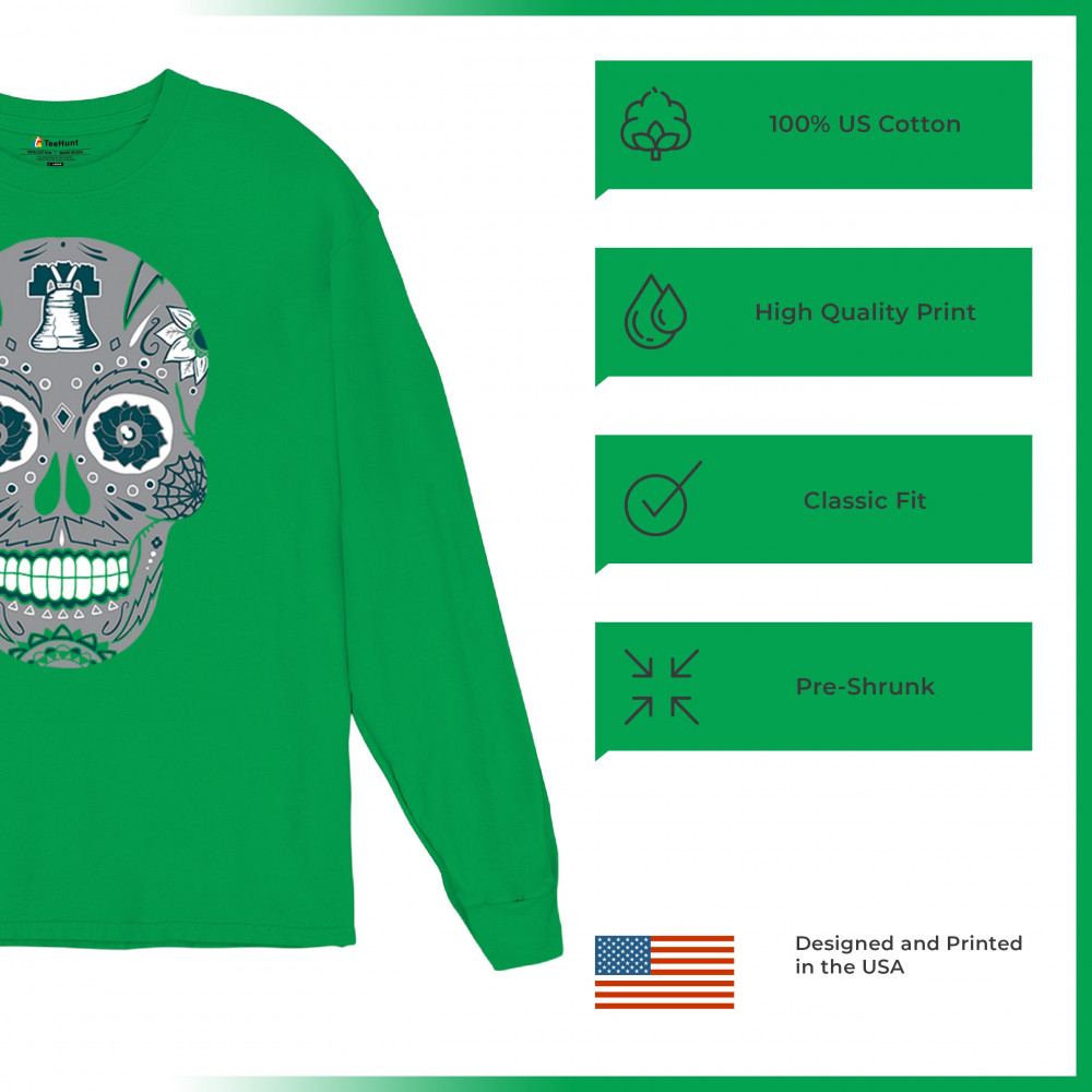 Philly meets tradition in this Sugar Skull design, mixing calavera art with the iconic liberty bell and marigold flowers. Perfect for Philly sports culture, fantasy league energy, or game day skull vibes, it captures Philly gothic art and fan zone spirit. A unique way to honor Dia de los Muertos while showing local Philadelphia pride and heritage in bold style.