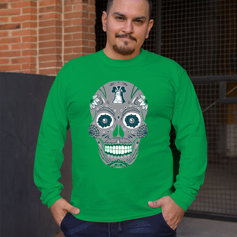 Philly sugar skull with liberty bell art, marigold flower calavera, gothic Philly art, sports culture pride, and game day skull vibes.