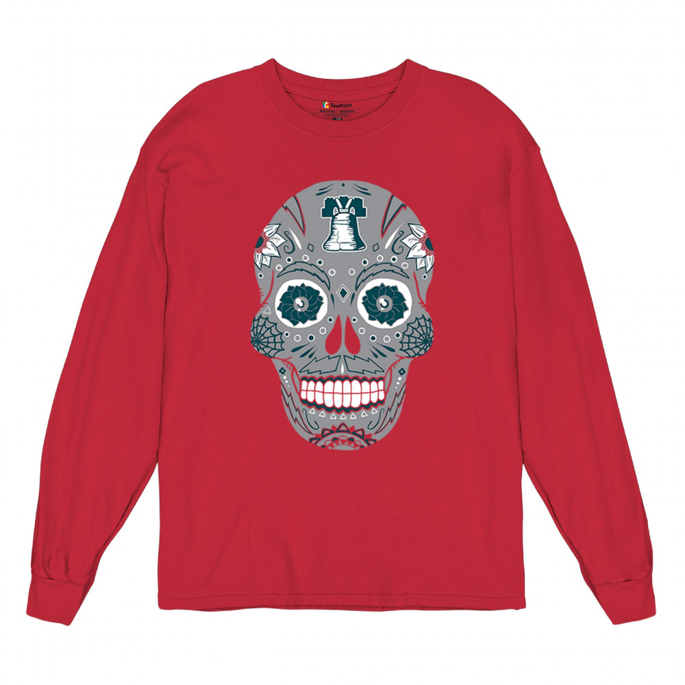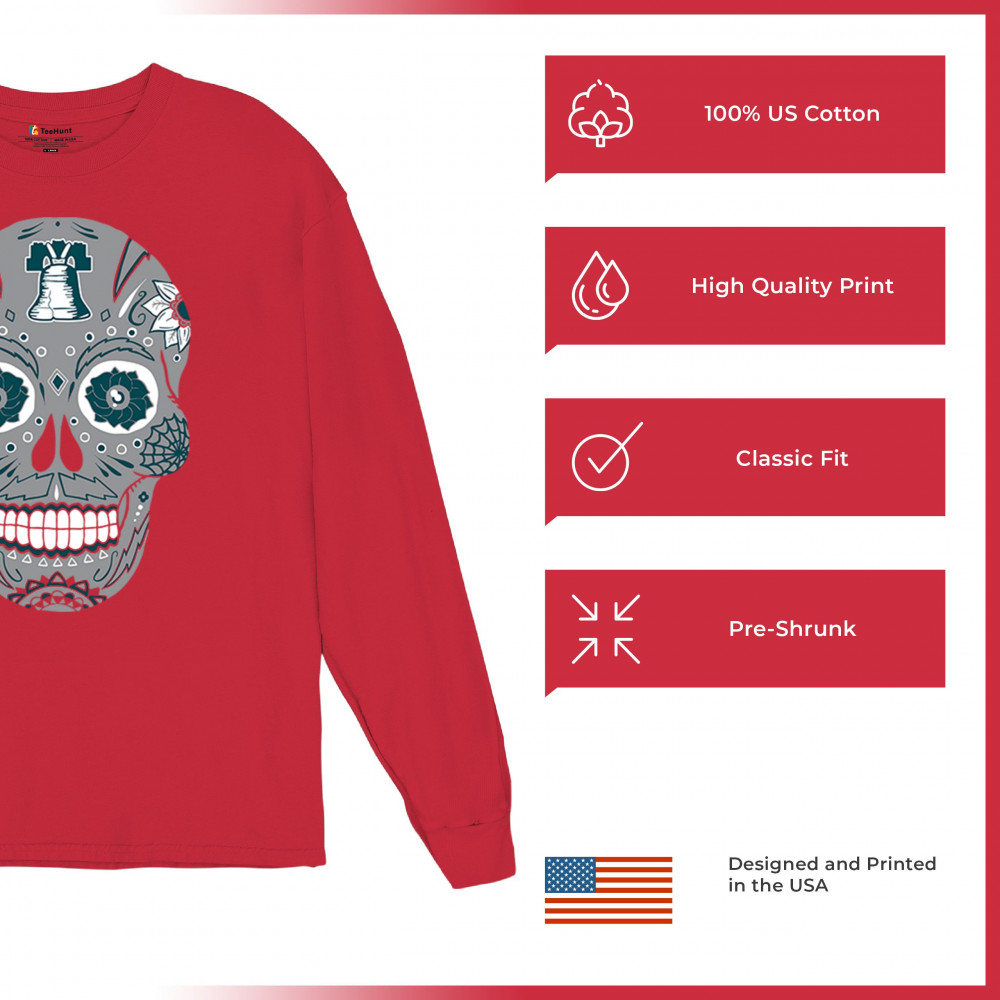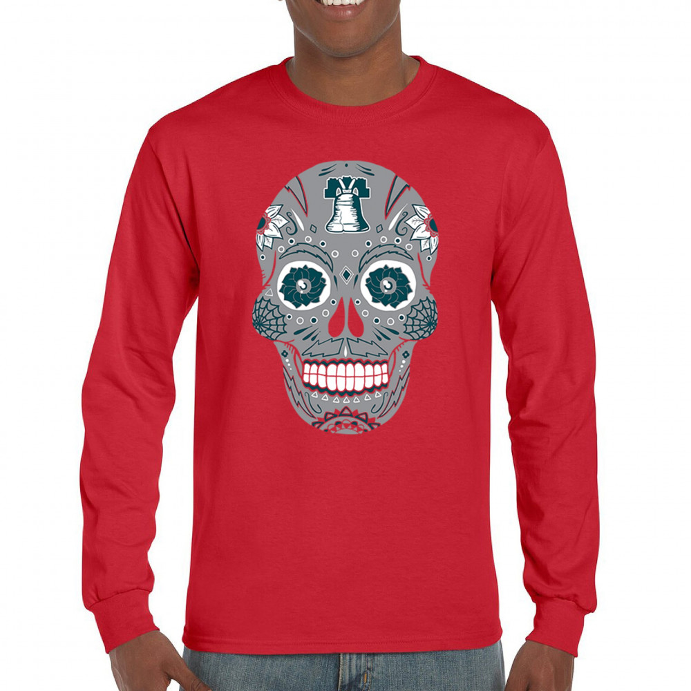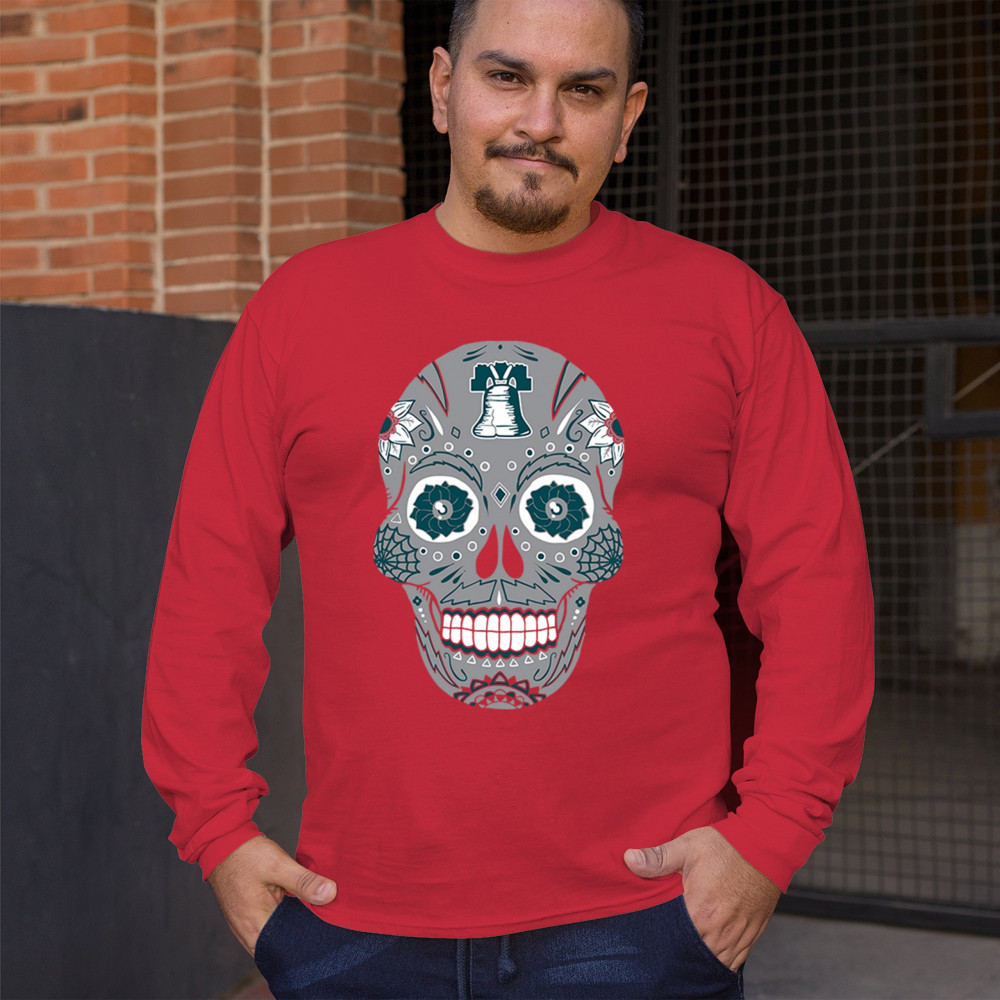 Philly meets tradition in this Sugar Skull design, mixing calavera art with the iconic liberty bell and marigold flowers. Perfect for Philly sports culture, fantasy league energy, or game day skull vibes, it captures Philly gothic art and fan zone spirit. A unique way to honor Dia de los Muertos while showing local Philadelphia pride and heritage in bold style.