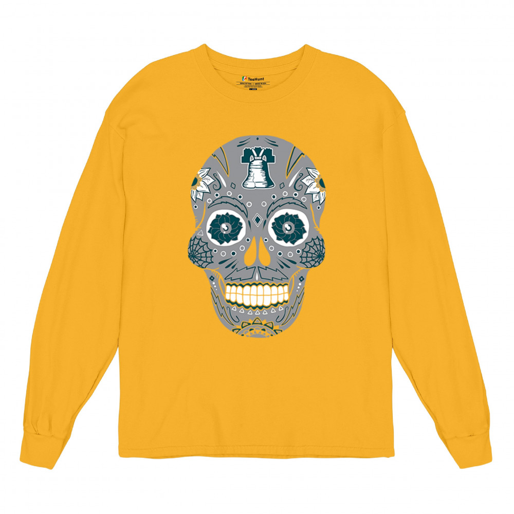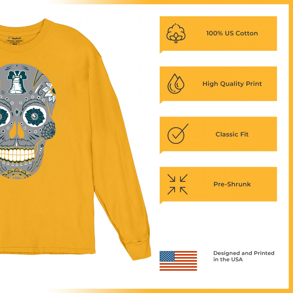 Philly meets tradition in this Sugar Skull design, mixing calavera art with the iconic liberty bell and marigold flowers. Perfect for Philly sports culture, fantasy league energy, or game day skull vibes, it captures Philly gothic art and fan zone spirit. A unique way to honor Dia de los Muertos while showing local Philadelphia pride and heritage in bold style.