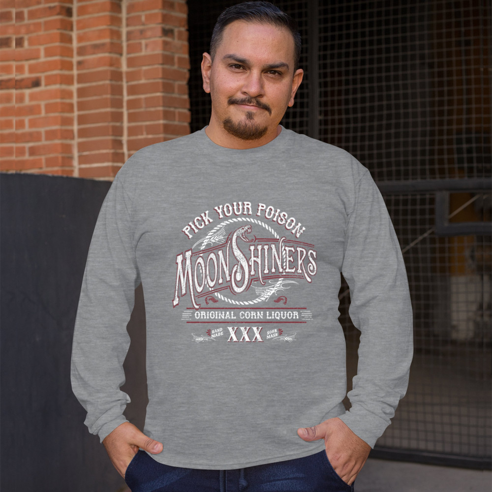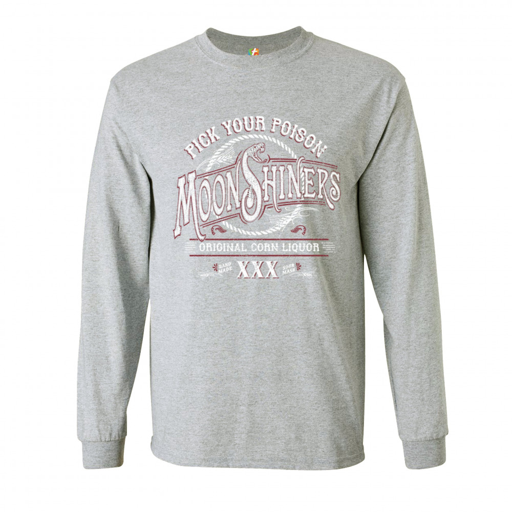 PICK YOUR POISON MOONSHINERS long sleeve t-shirt original corn liquor xxx gray