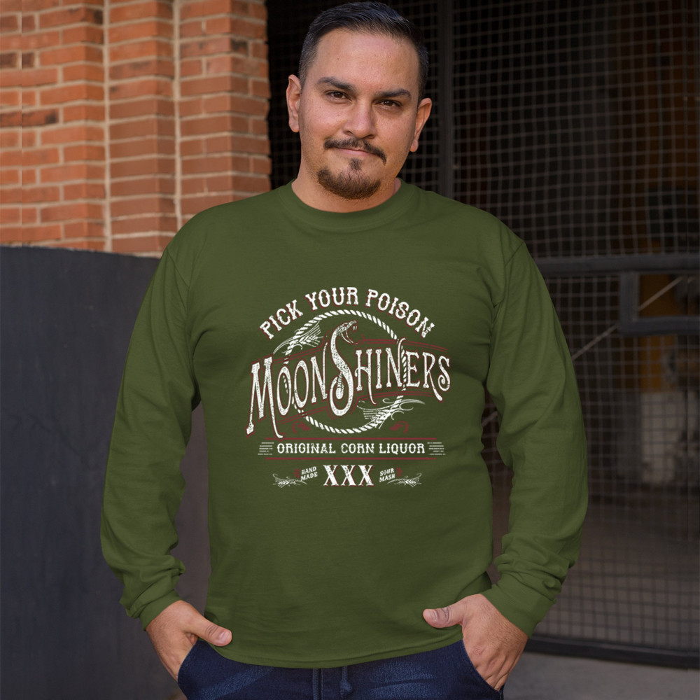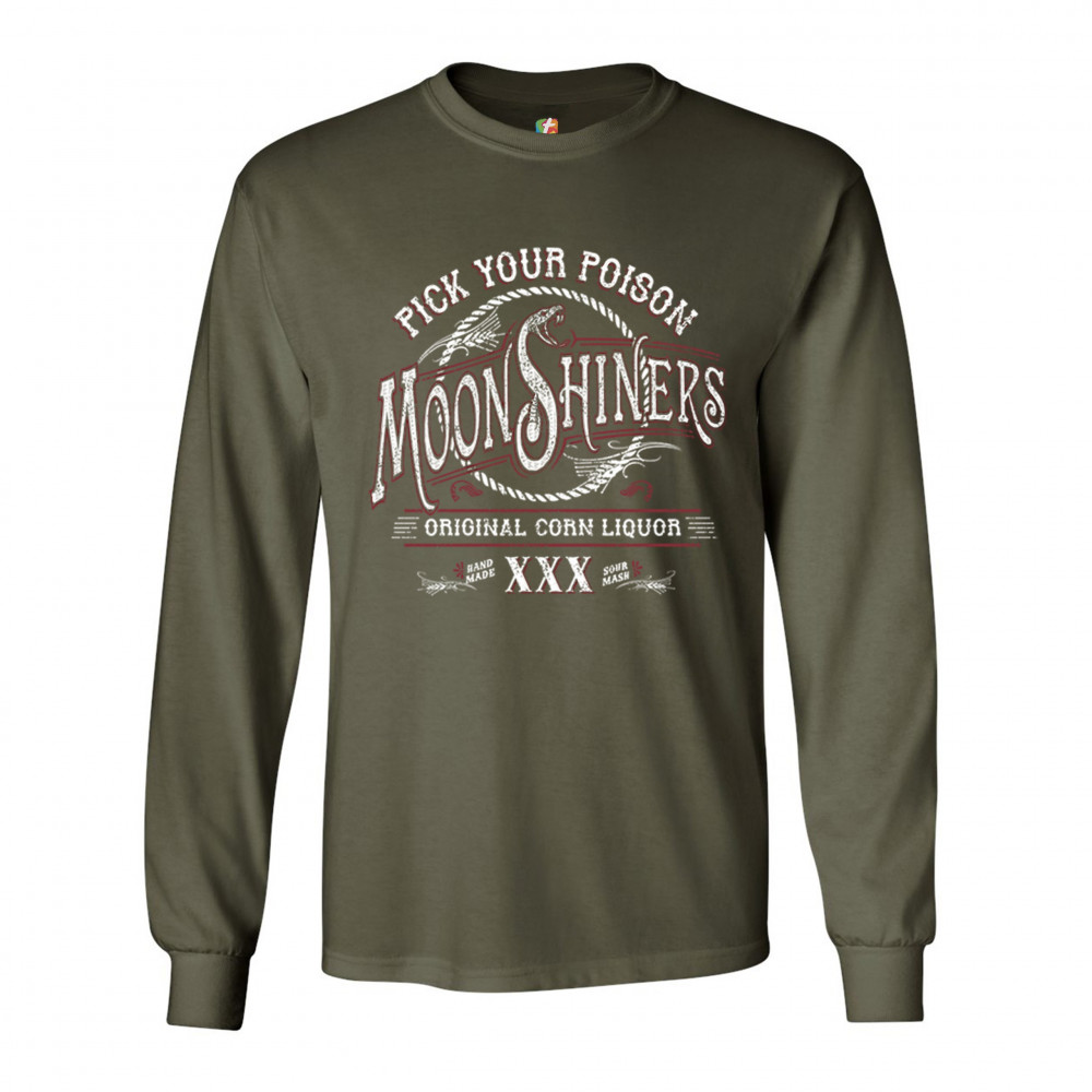 PICK YOUR POISON MOONSHINERS long sleeve t-shirt original corn liquor xxx military green