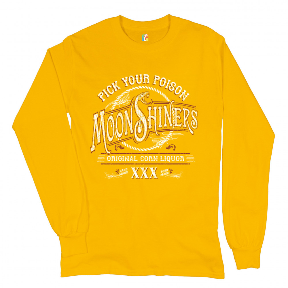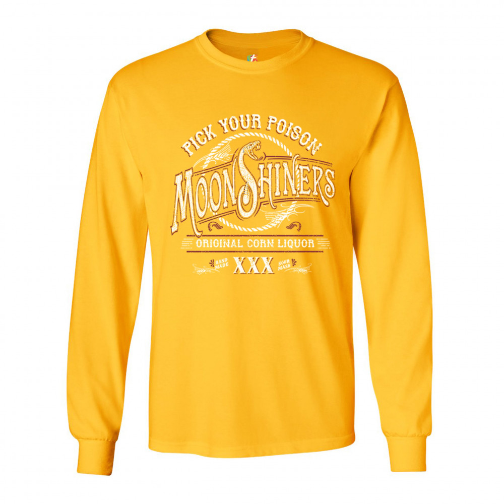 PICK YOUR POISON MOONSHINERS long sleeve t-shirt original corn liquor xxx yellow