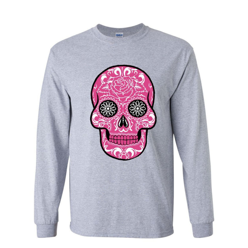 CALAVERA PINK SUGAR SKULL pink sugar skull with roses long sleeve t-shirt day of the dead tee gray