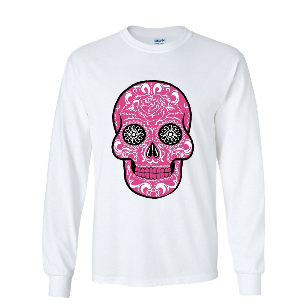 CALAVERA PINK SUGAR SKULL pink sugar skull with roses long sleeve t-shirt day of the dead tee white