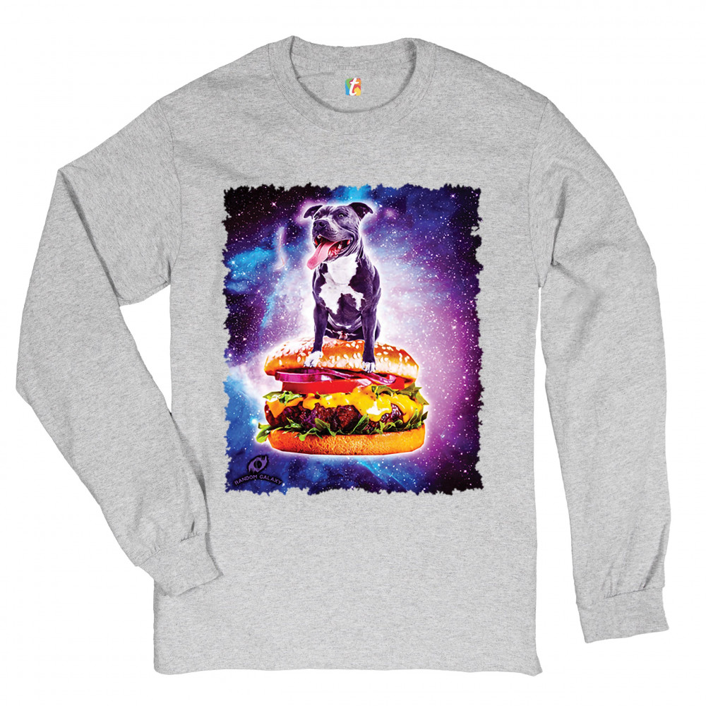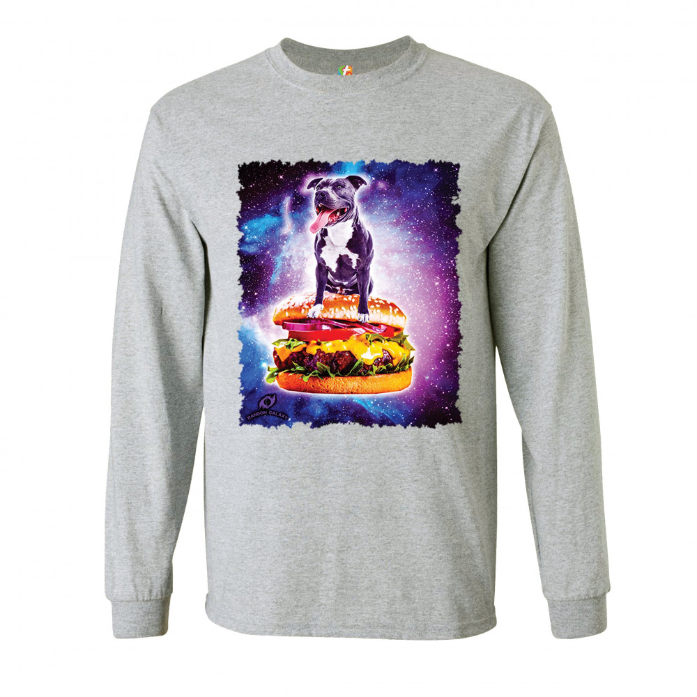 PIT BULL RIDING A BURGER FLYING THROUGH GALAXY long sleeve t-shirt funny pet gray