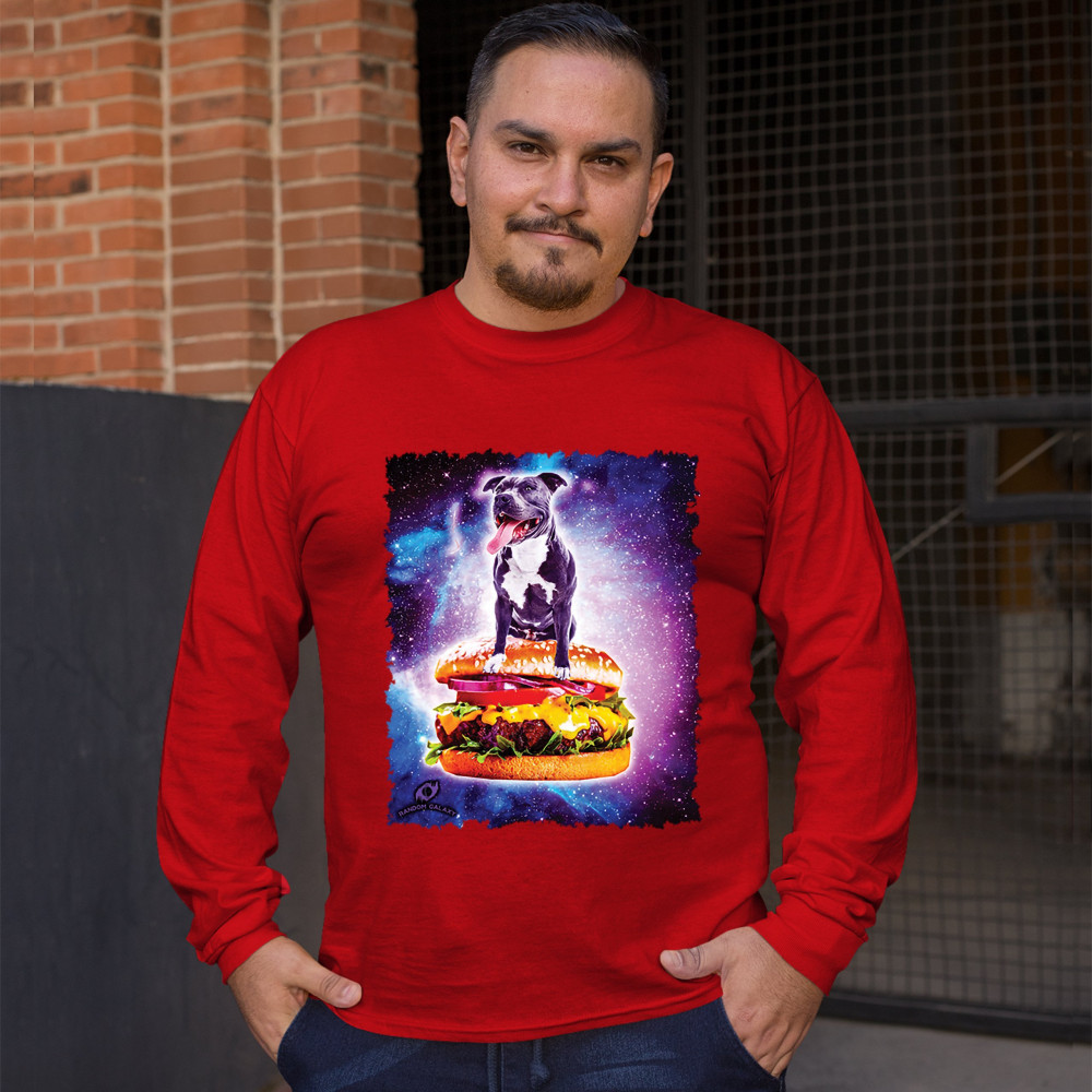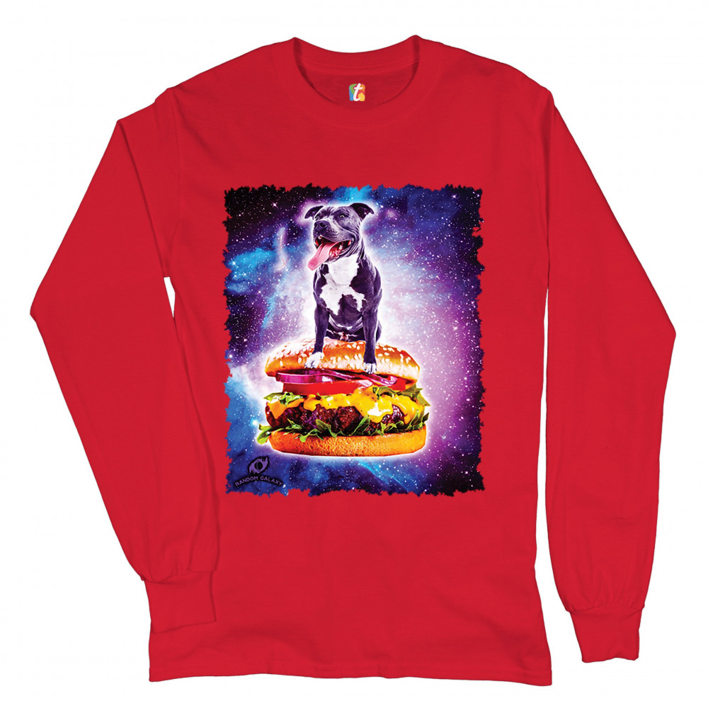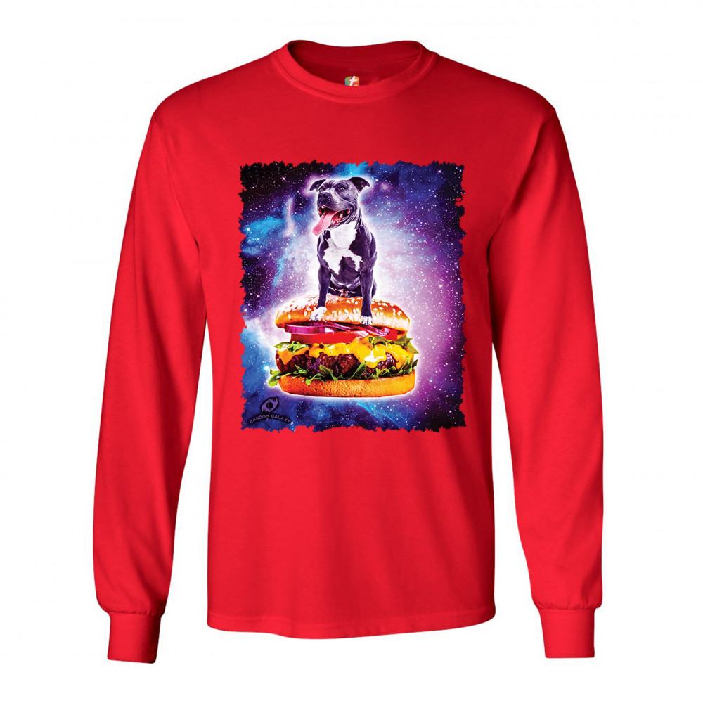 PIT BULL RIDING A BURGER FLYING THROUGH GALAXY long sleeve t-shirt funny pet red