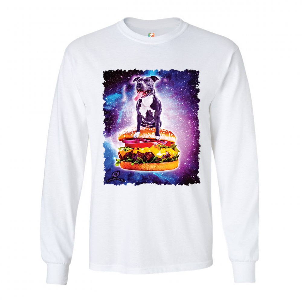 PIT BULL RIDING A BURGER FLYING THROUGH GALAXY long sleeve t-shirt funny pet white