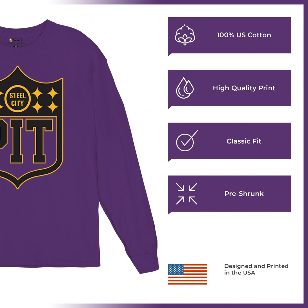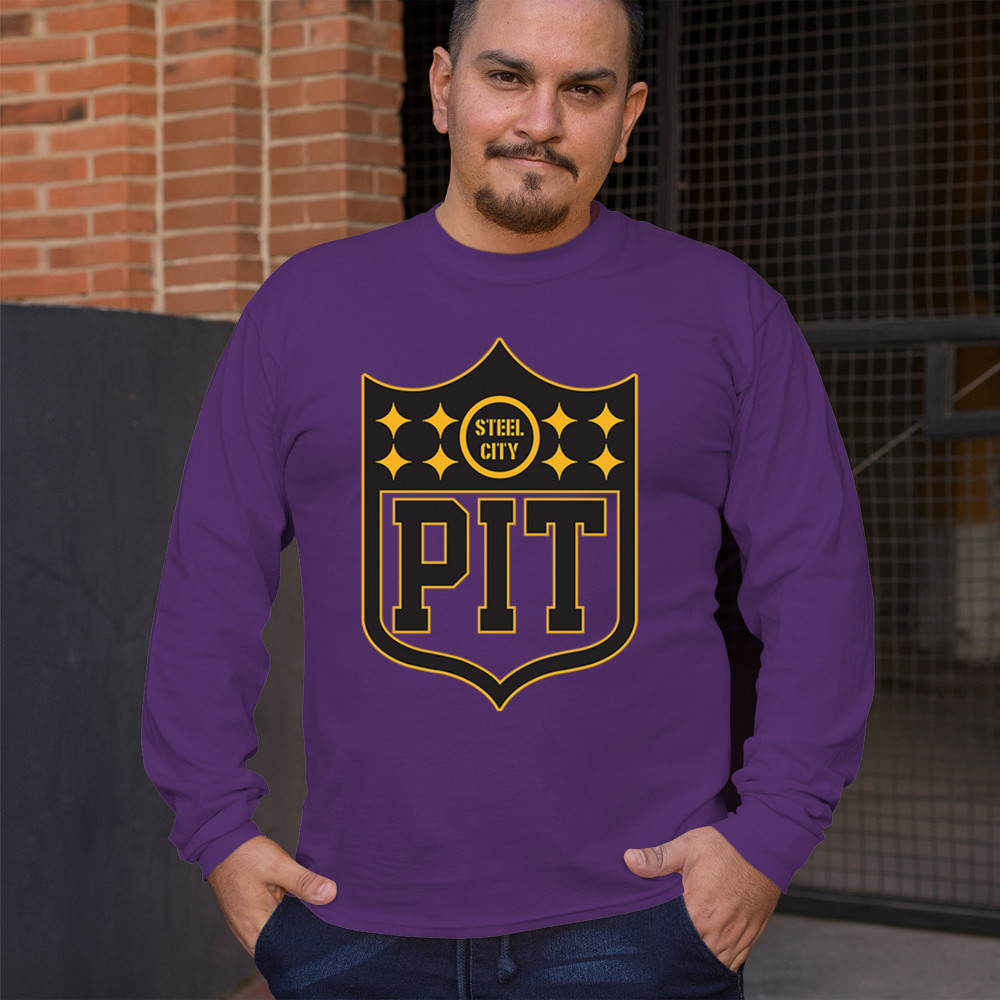 Steel City PIT shield football gear celebrating Pittsburgh football nation, gridiron tradition, playoff vibes, and sports heritage.