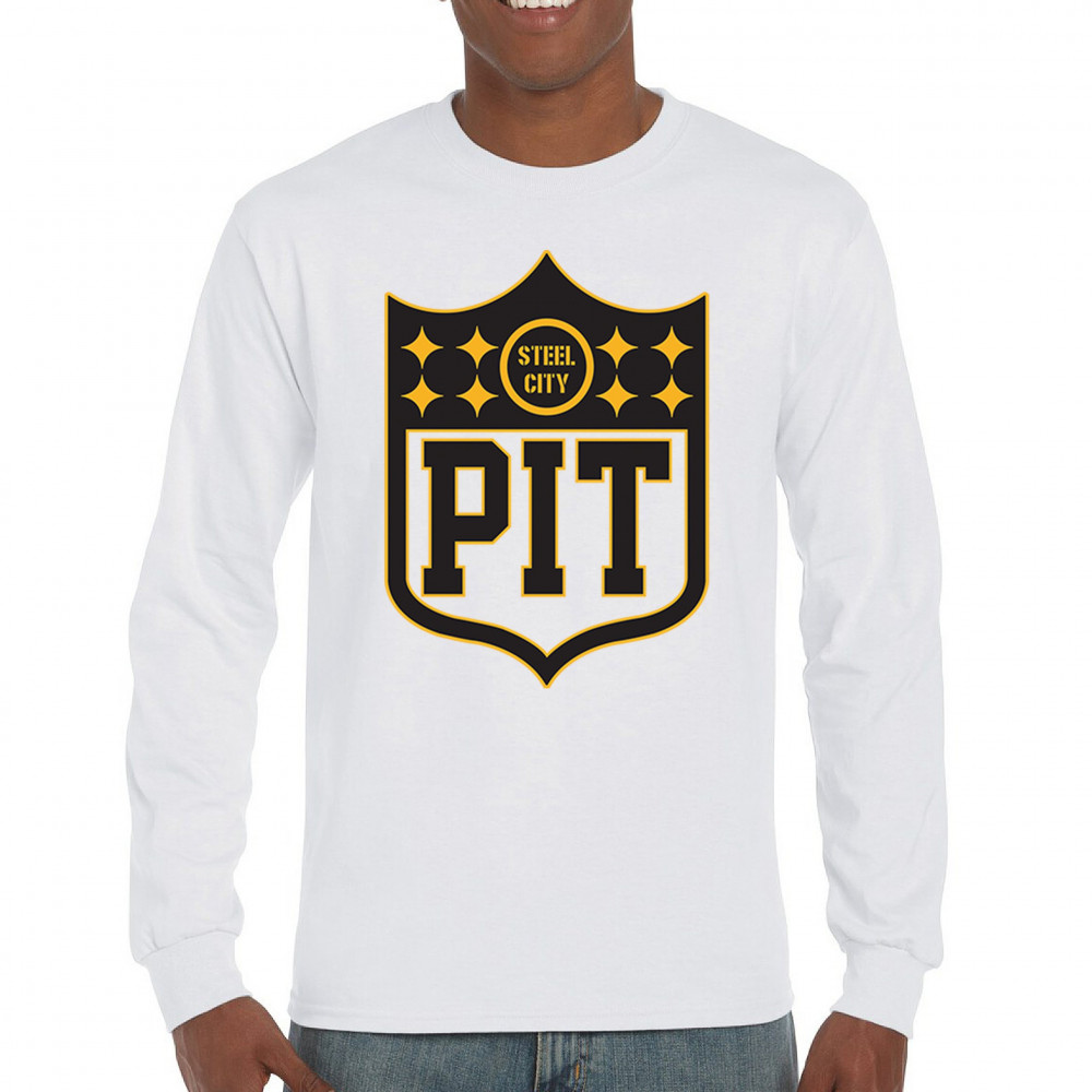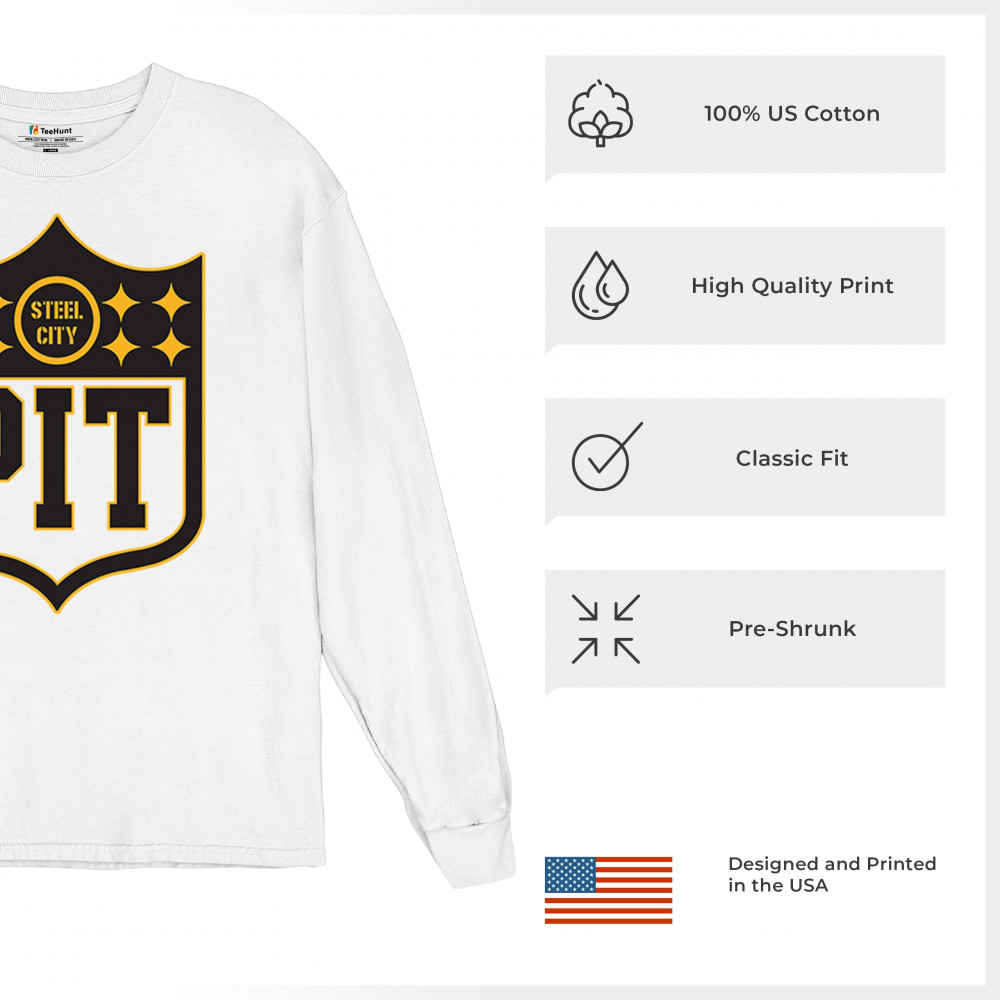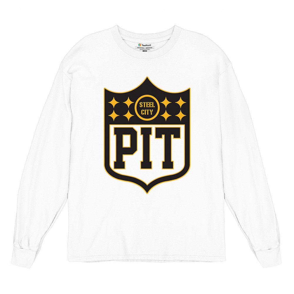 Steel City PIT shield football gear celebrating Pittsburgh football nation, gridiron tradition, playoff vibes, and sports heritage.