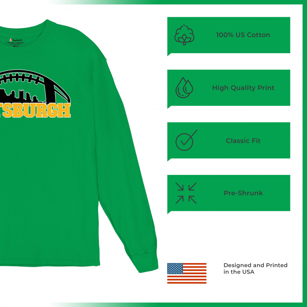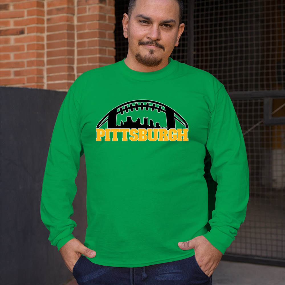 Embrace your Steel City pride with this bold Pittsburgh-themed design, showcasing the city skyline in a unique football graphic. Perfect for game day celebrations, tailgating parties, or everyday wear, this design captures the energy and passion of Pittsburgh's legendary sports culture. Whether you're cheering on your favorite team or representing your city, this design is a must-have for Pittsburgh fans.