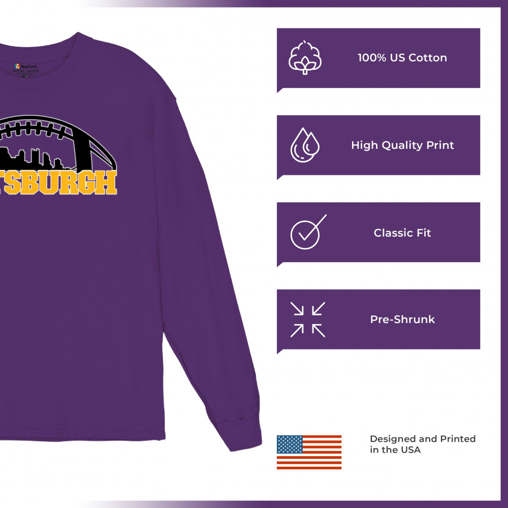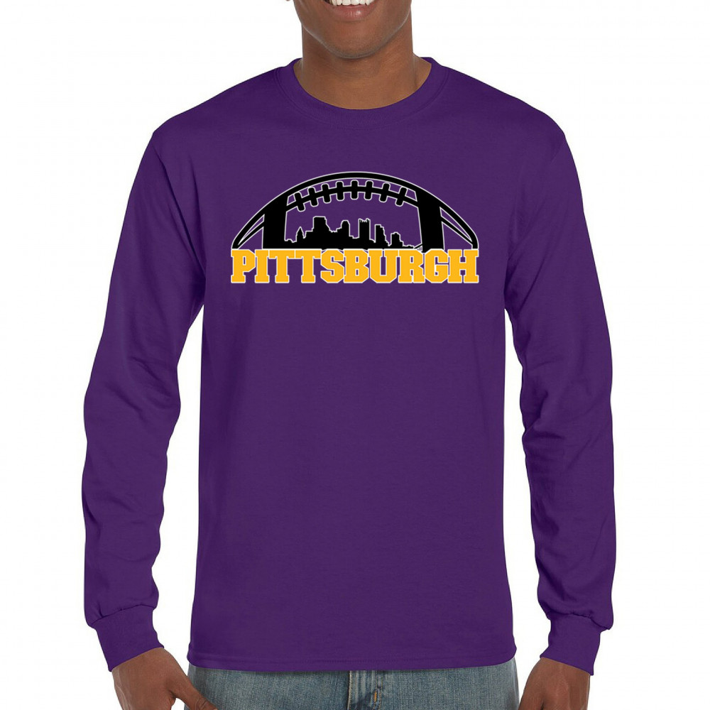 Embrace your Steel City pride with this bold Pittsburgh-themed design, showcasing the city skyline in a unique football graphic. Perfect for game day celebrations, tailgating parties, or everyday wear, this design captures the energy and passion of Pittsburgh's legendary sports culture. Whether you're cheering on your favorite team or representing your city, this design is a must-have for Pittsburgh fans.