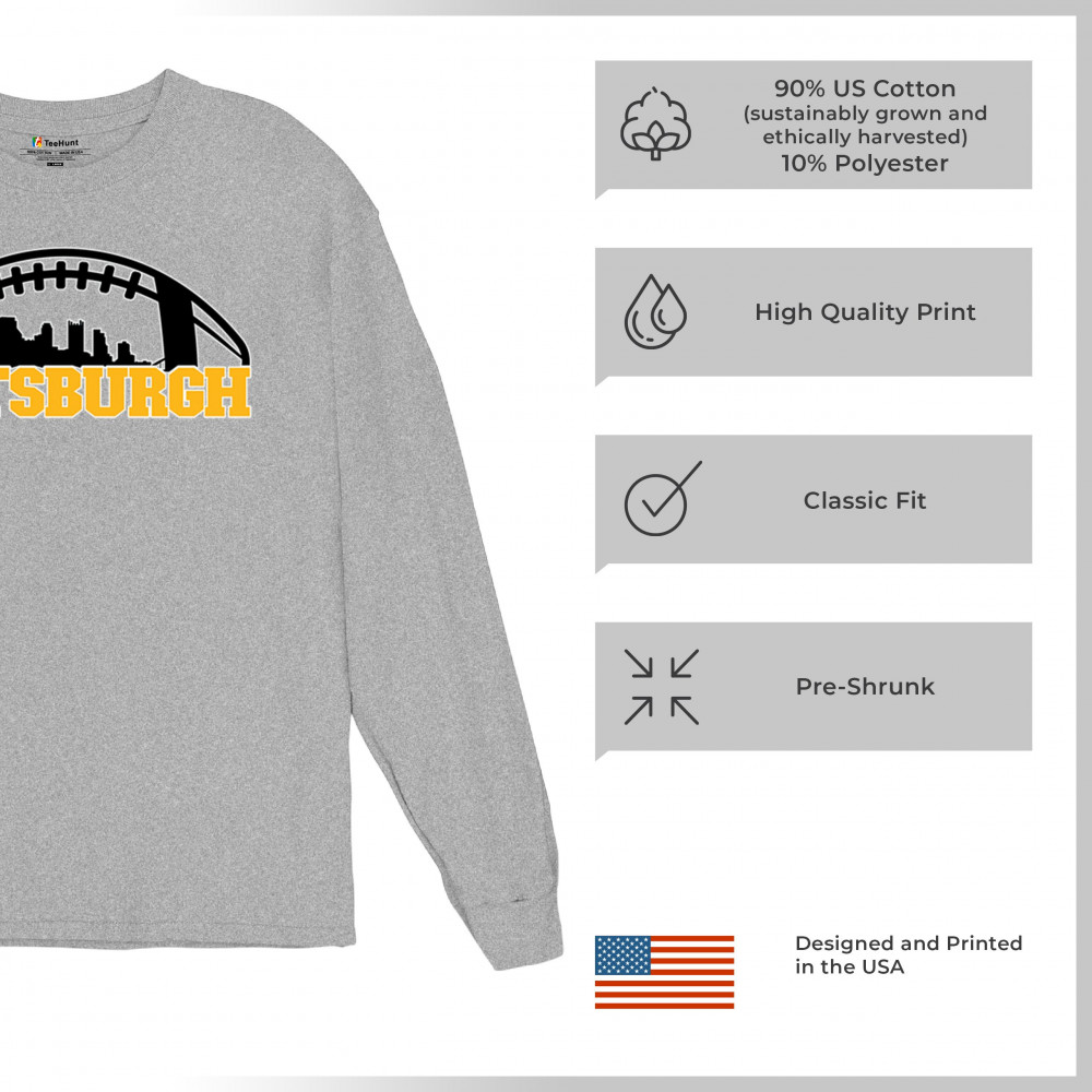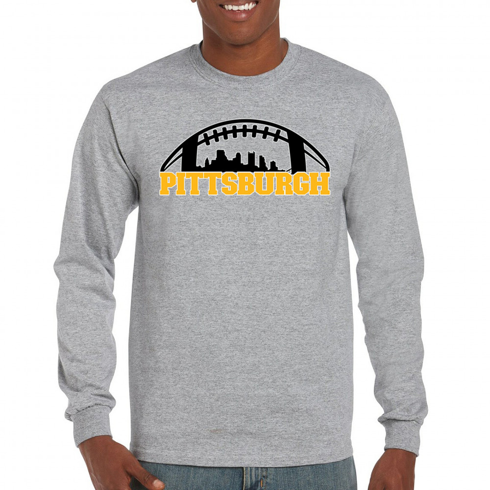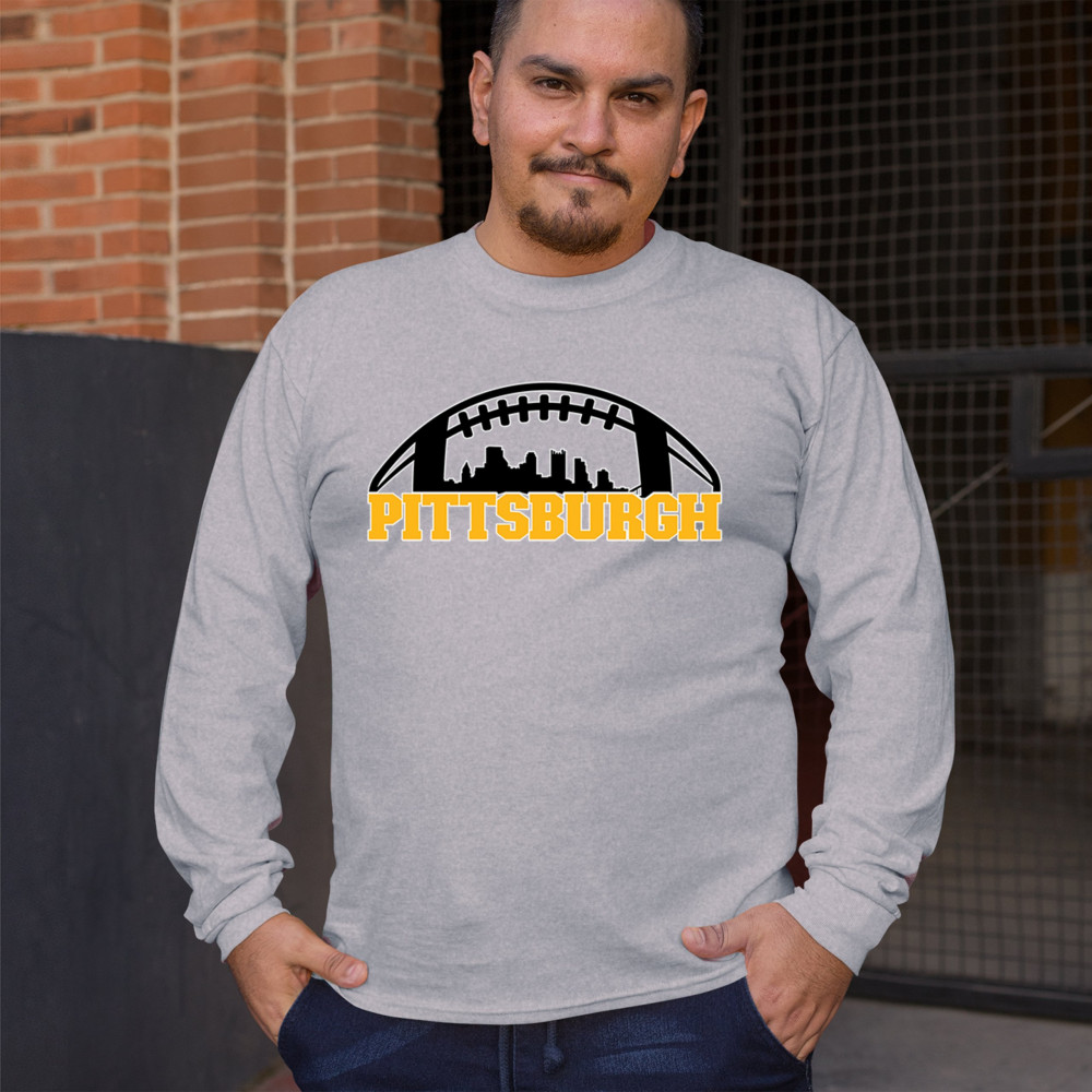 Embrace your Steel City pride with this bold Pittsburgh-themed design, showcasing the city skyline in a unique football graphic. Perfect for game day celebrations, tailgating parties, or everyday wear, this design captures the energy and passion of Pittsburgh's legendary sports culture. Whether you're cheering on your favorite team or representing your city, this design is a must-have for Pittsburgh fans.
