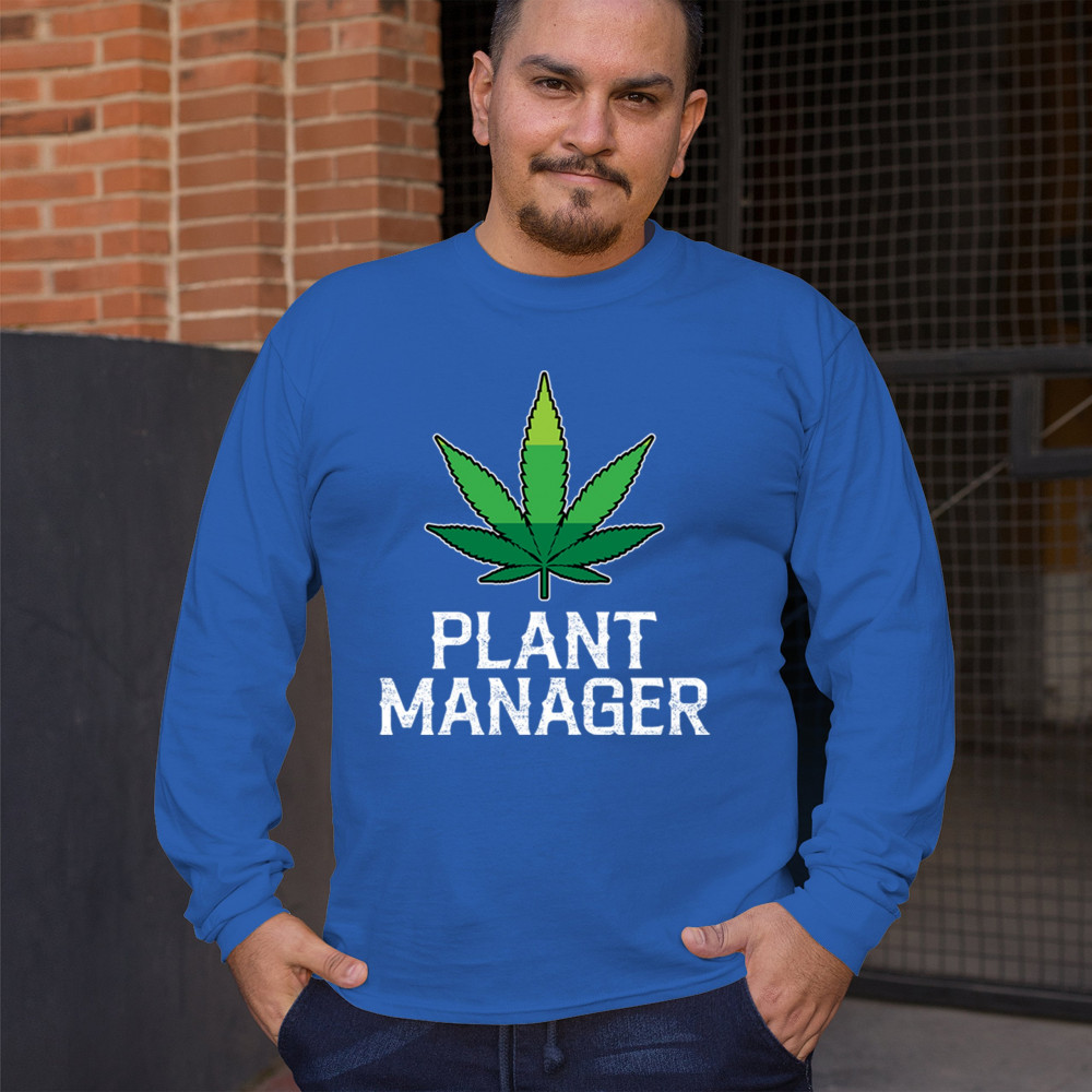 Humorous "Plant Manager" design featuring a bold green cannabis leaf. Perfect for fans of Mary Jane, stoned humor, and relaxed style. Ideal for chill vibes.