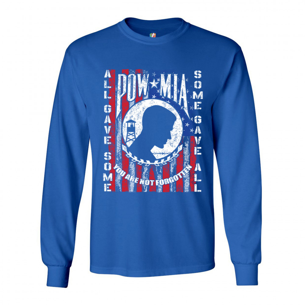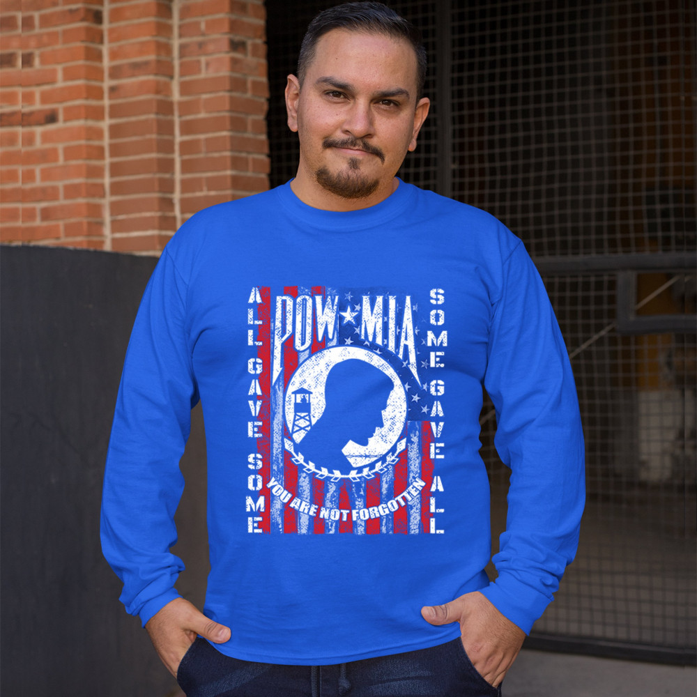A patriotic print featuring the combination of the National League of Families' POW/MIA flag with a distressed American flag. On the sides of the flag it features the phrase: "All Gave Some, Some Gave All". Great choice to wear on Patriot's Day, Memorial