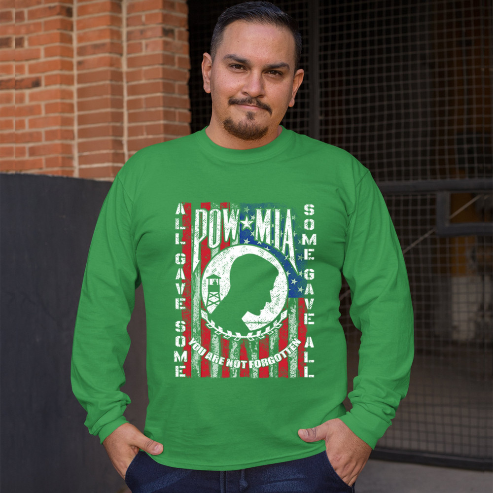A patriotic print featuring the combination of the National League of Families' POW/MIA flag with a distressed American flag. On the sides of the flag it features the phrase: "All Gave Some, Some Gave All". Great choice to wear on Patriot's Day, Memorial
